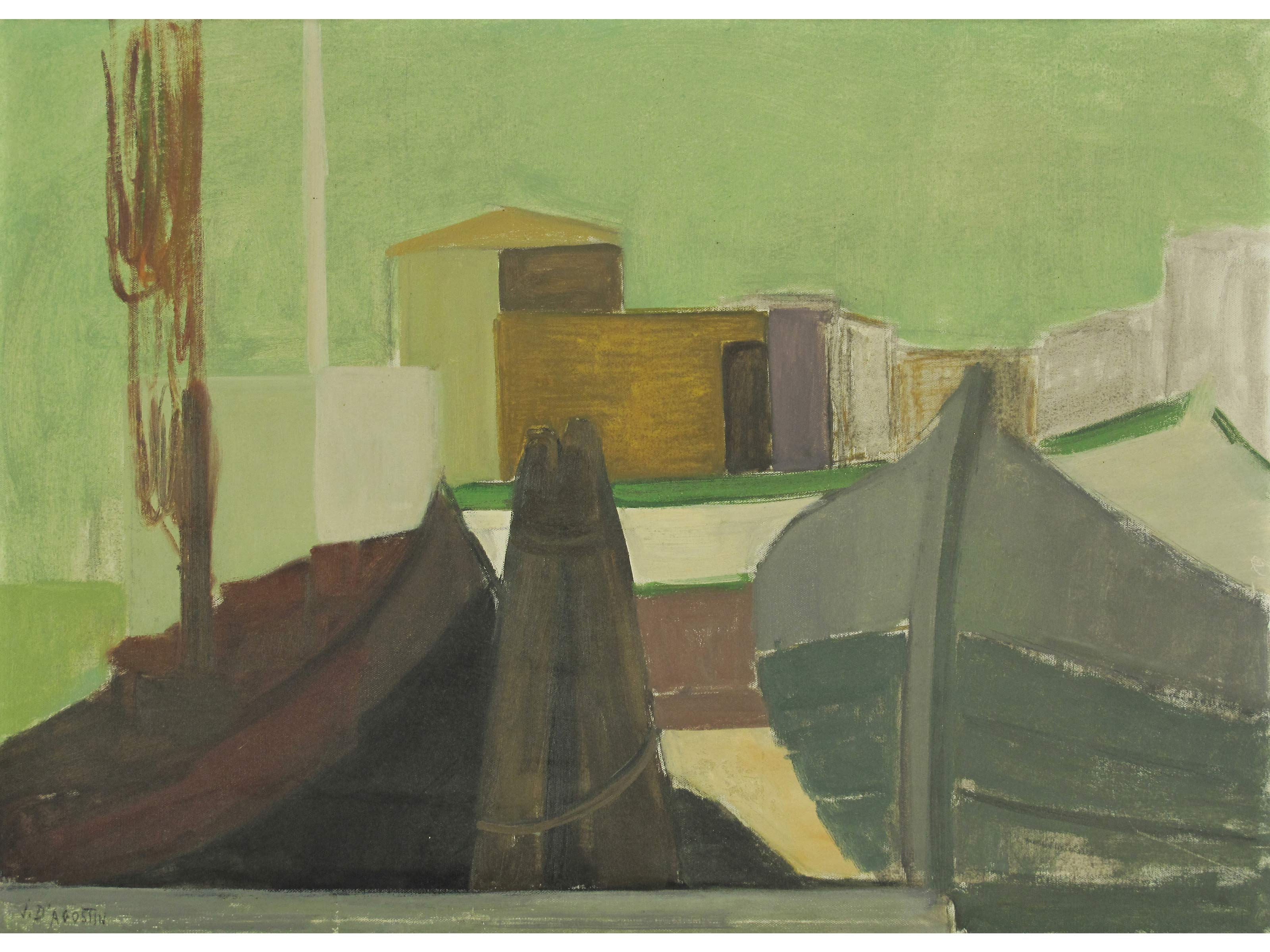 V. D'Agostin (XX secolo) Profili di barche Olio su tela Firmato Senza cornice Misure 50x70 cm