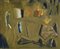 Su uno sfondo ocra-brunastro, i suoi colori preferiti, appaiono come ricordi svaniti nel tempo e nel divenire delle cose piccole figure, accenni di montagne, edifici evanescenti.
