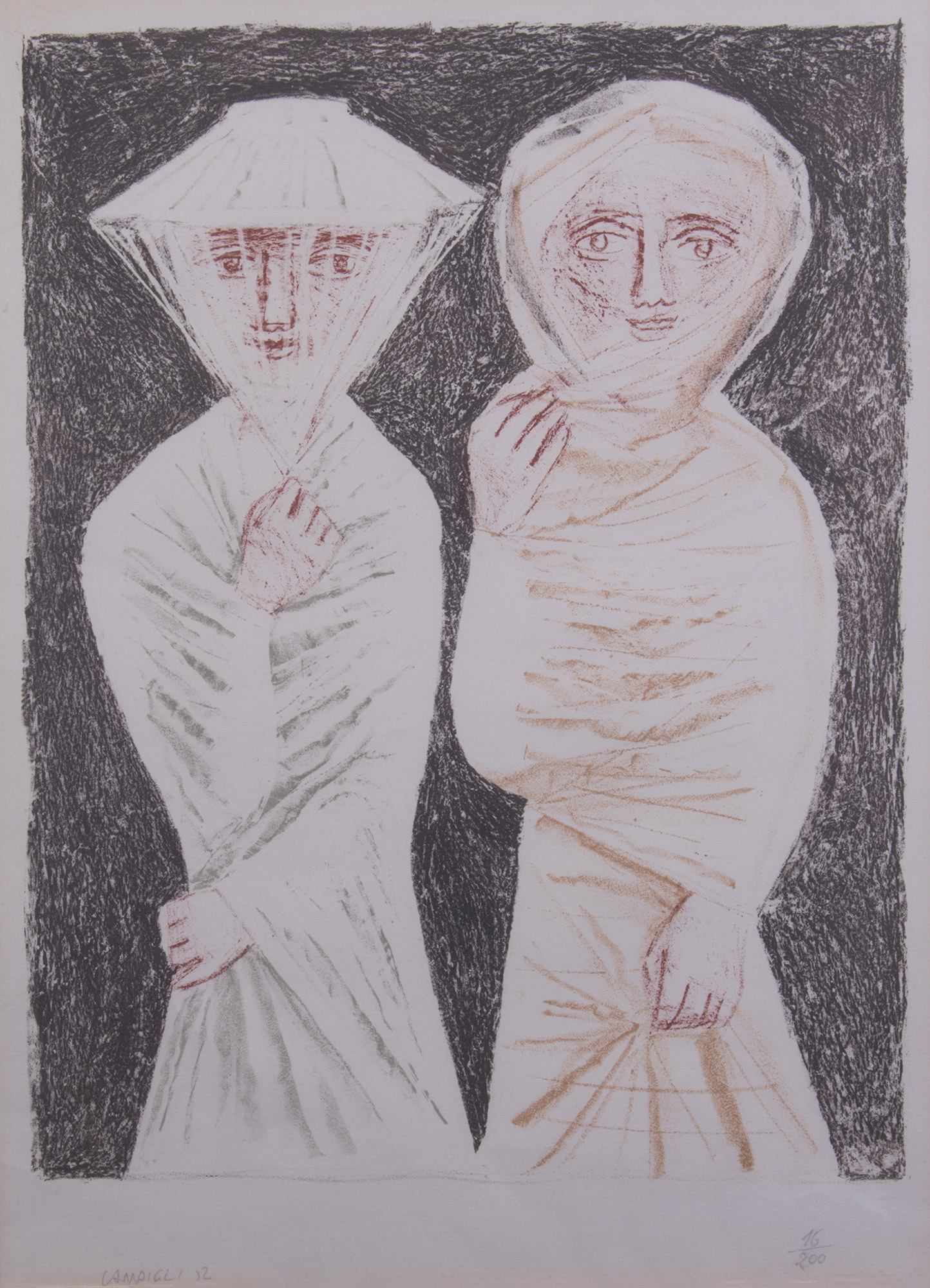 A) La passeggiata, 1952, litografia a colori, es. 16/200, cm. 43x32 (lastra), cm. 52x37,8 (carta). Firma e data a matita sul margine in basso a sinistra: Campigli 52, tiratura in basso a destra: 16/200. Tiratura di 200 esemplari in numeri arabi, 60 in numeri romani e alcune prove, editore Guilde Internationale de la Gravure, Ginevra-Parigi, Stampatore Desjobert, Parigi;