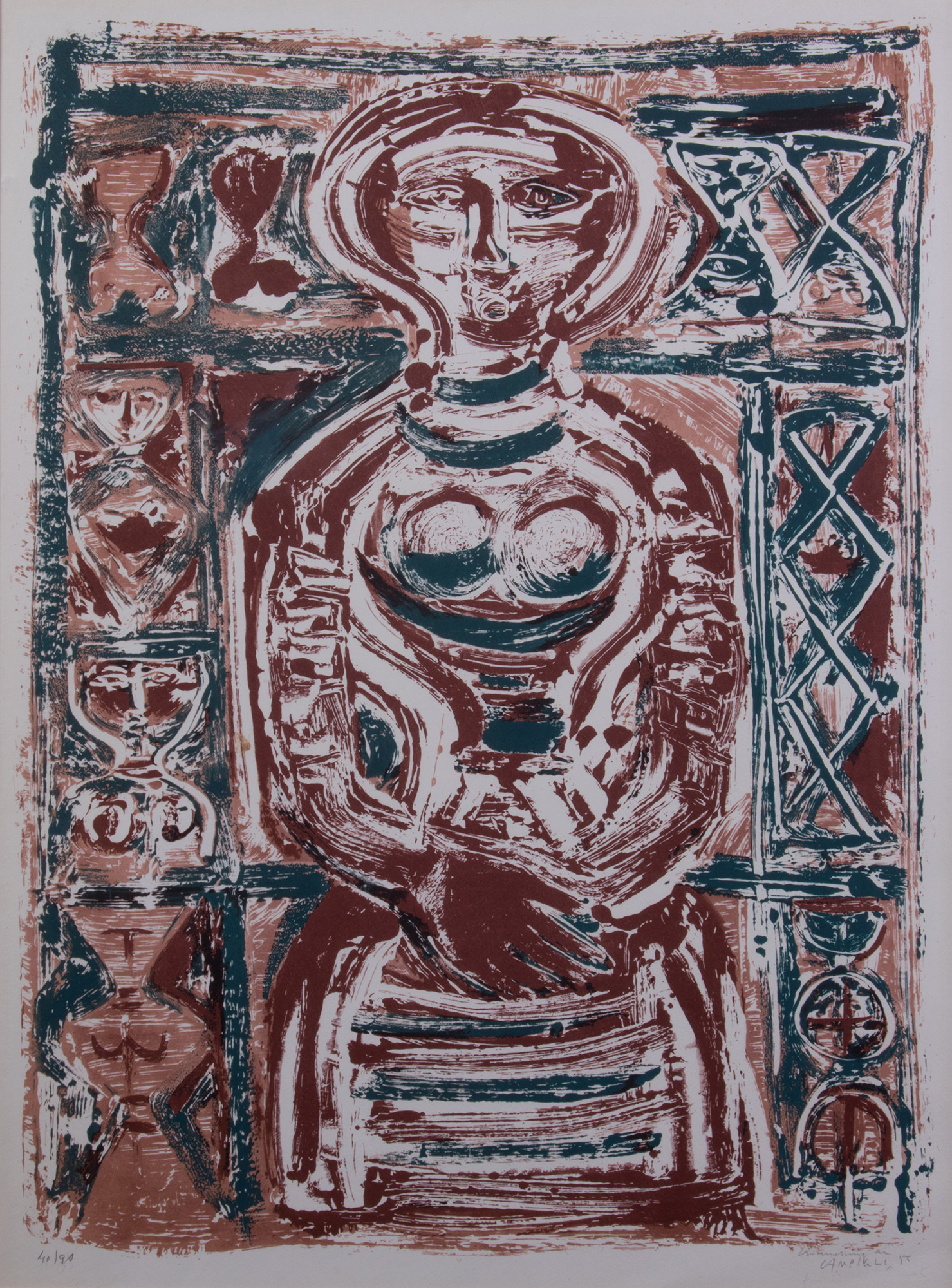 B) Senza titolo, 1955, litografia a colori, es. 40/90, cm. 50x36,3 (lastra), cm. 58,3x41,4 (carta). Firma e data a matita sul margine in basso a destra: Campigli 55, tiratura in basso a sinistra: 40/90.