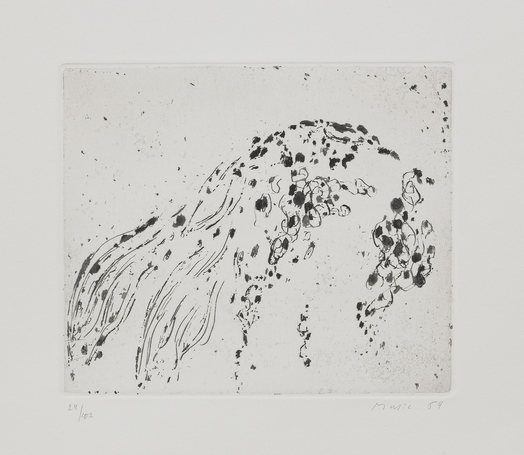 Firma e data a matita sul margine in basso a destra: Music 64, tiratura in basso a sinistra: 24/102.