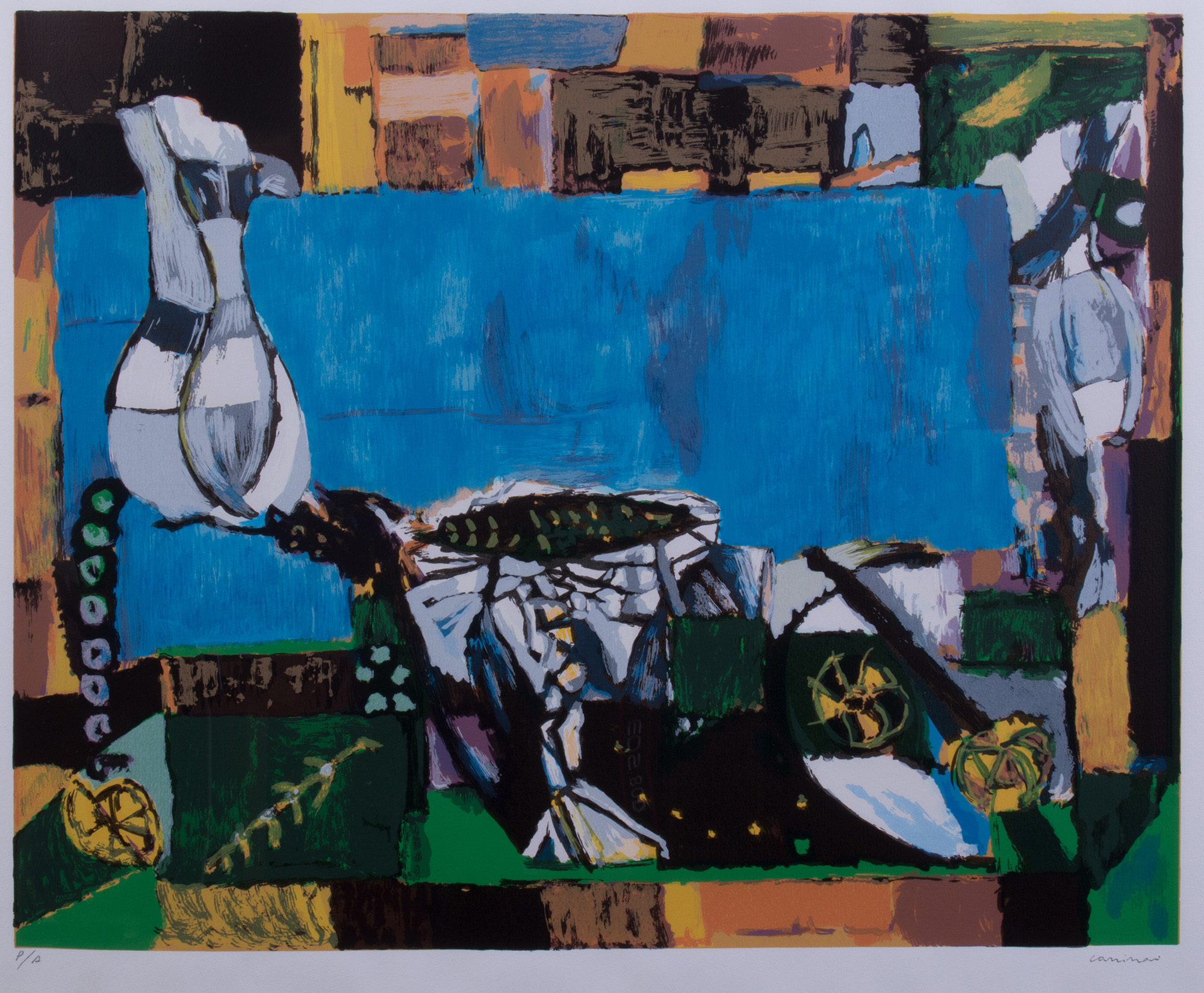A) Bruno Cassinari, Senza titolo, litografia a colori, es. P/A, cm. 44x55 (lastra), cm. 50x70 (carta). Firma a matita sul margine in basso a destra: Cassinari: timbro a secco MA, tiratura in basso a sinistra: P/A;