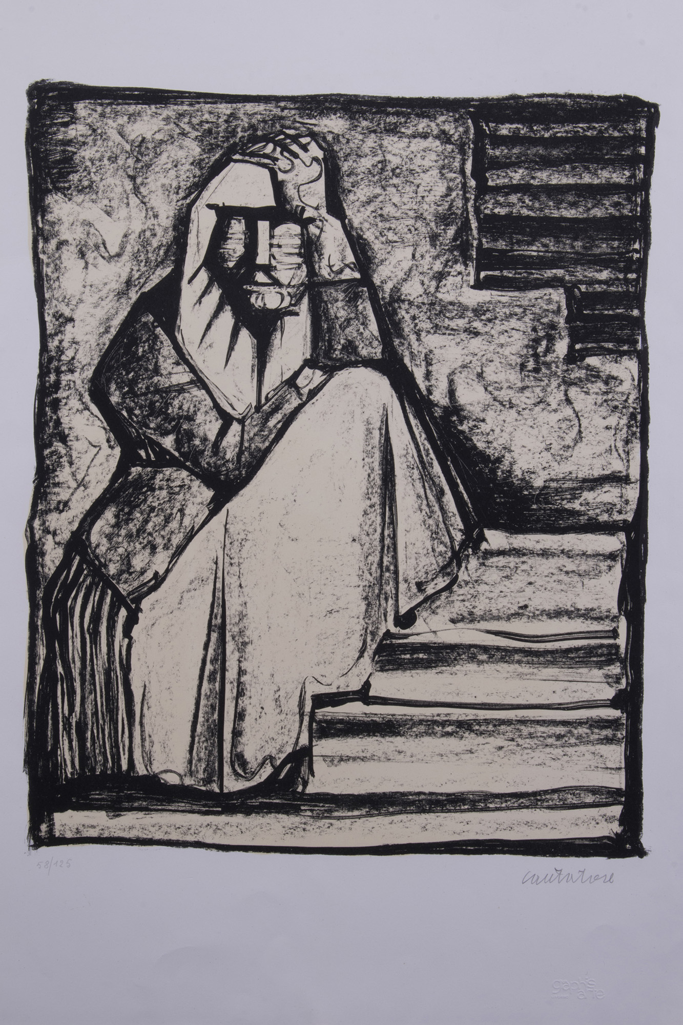B) Domenico Cantatore, Figura seduta, litografia, es. 58/125, cm. 44,5x36,6 (lastra), cm. 70x50,5 (carta). Firma a matita sul margine in basso a destra: Cassinari, tiratura in basso a sinistra.