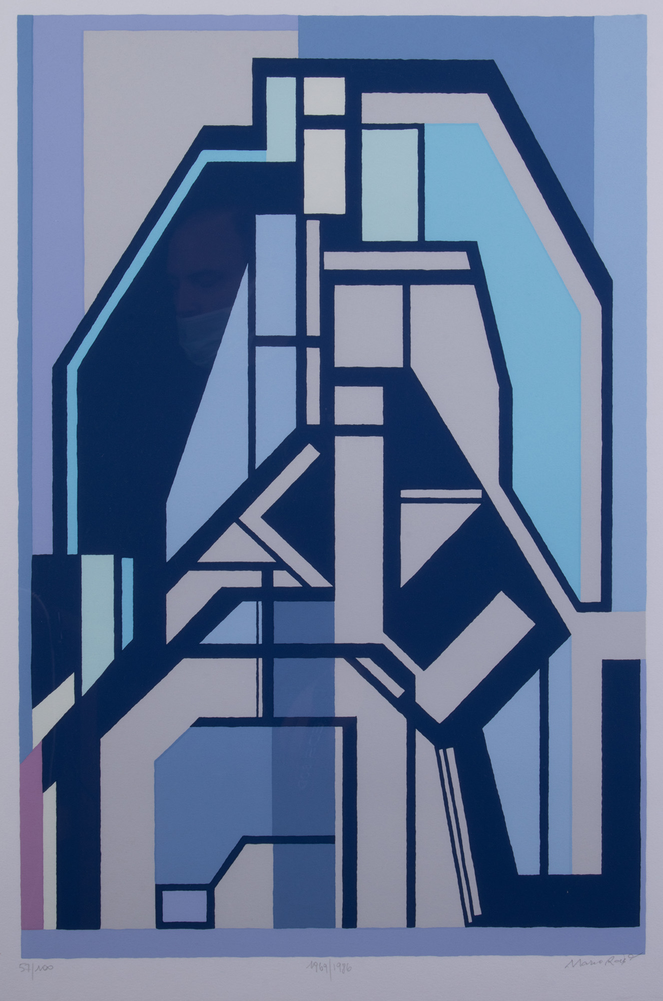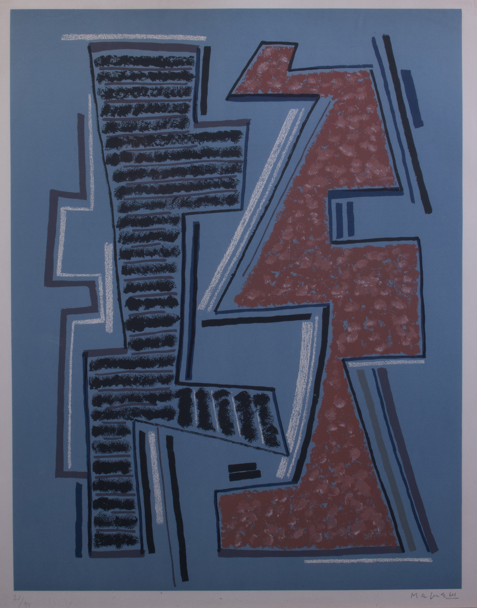 B) Mario Radice, Senza titolo, 1969/86, litografia, es. 57/100, cm. 69,5x49,5 (carta). Tiratura, data e firma a matita sul margine in basso: 57/100 / 1969/1986 / Mario Radice.