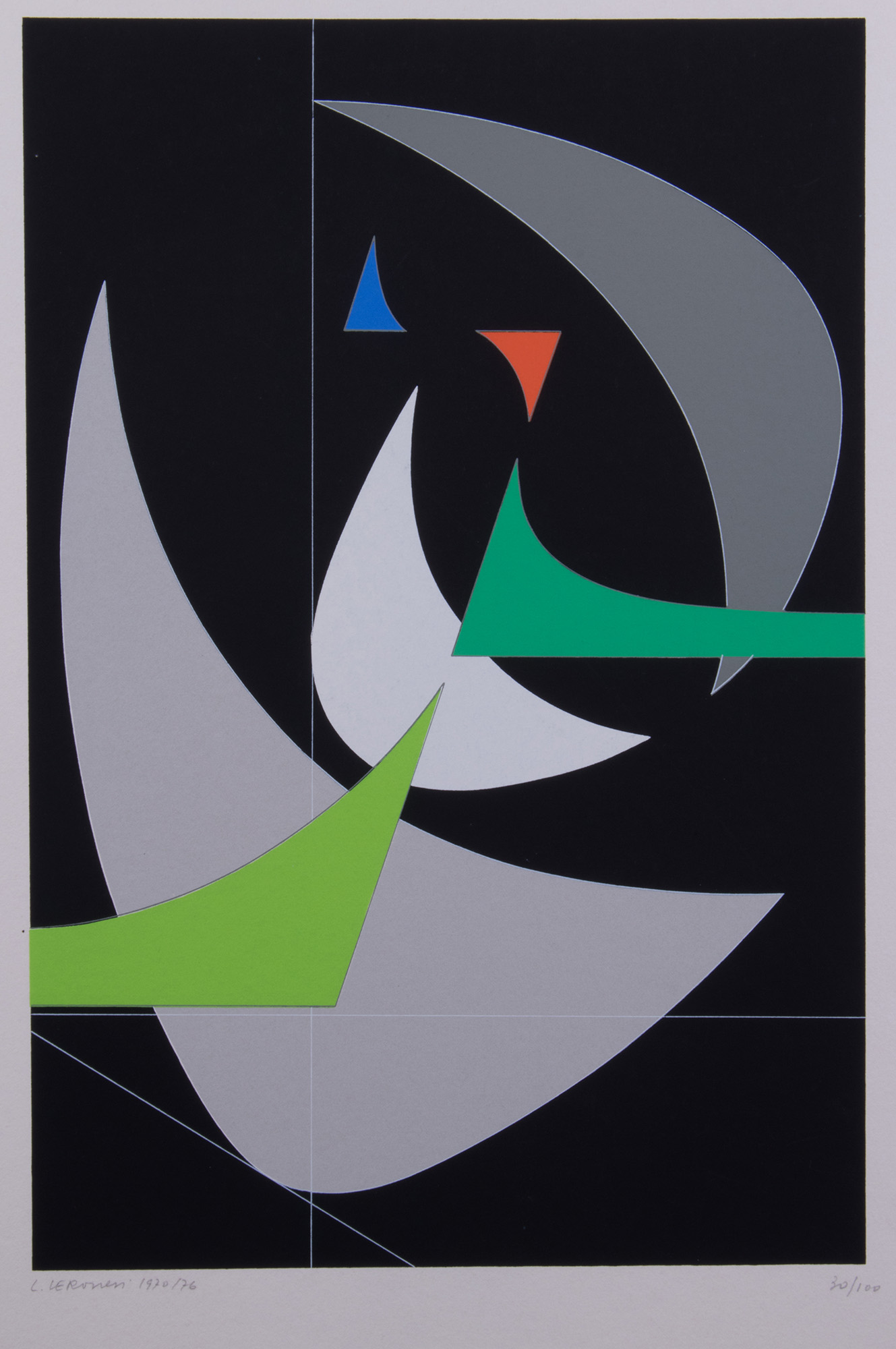 A) Luigi Veronesi, Senza titolo, 1970-76, litografia a colori, es. 30/100, cm. 42,4x28,5 (lastra), cm. 70x50 (carta). Firma e data a matita sul margine in basso a sinistra: L. Veronesi 1970/76, tiratura in basso a destra: 30/100;