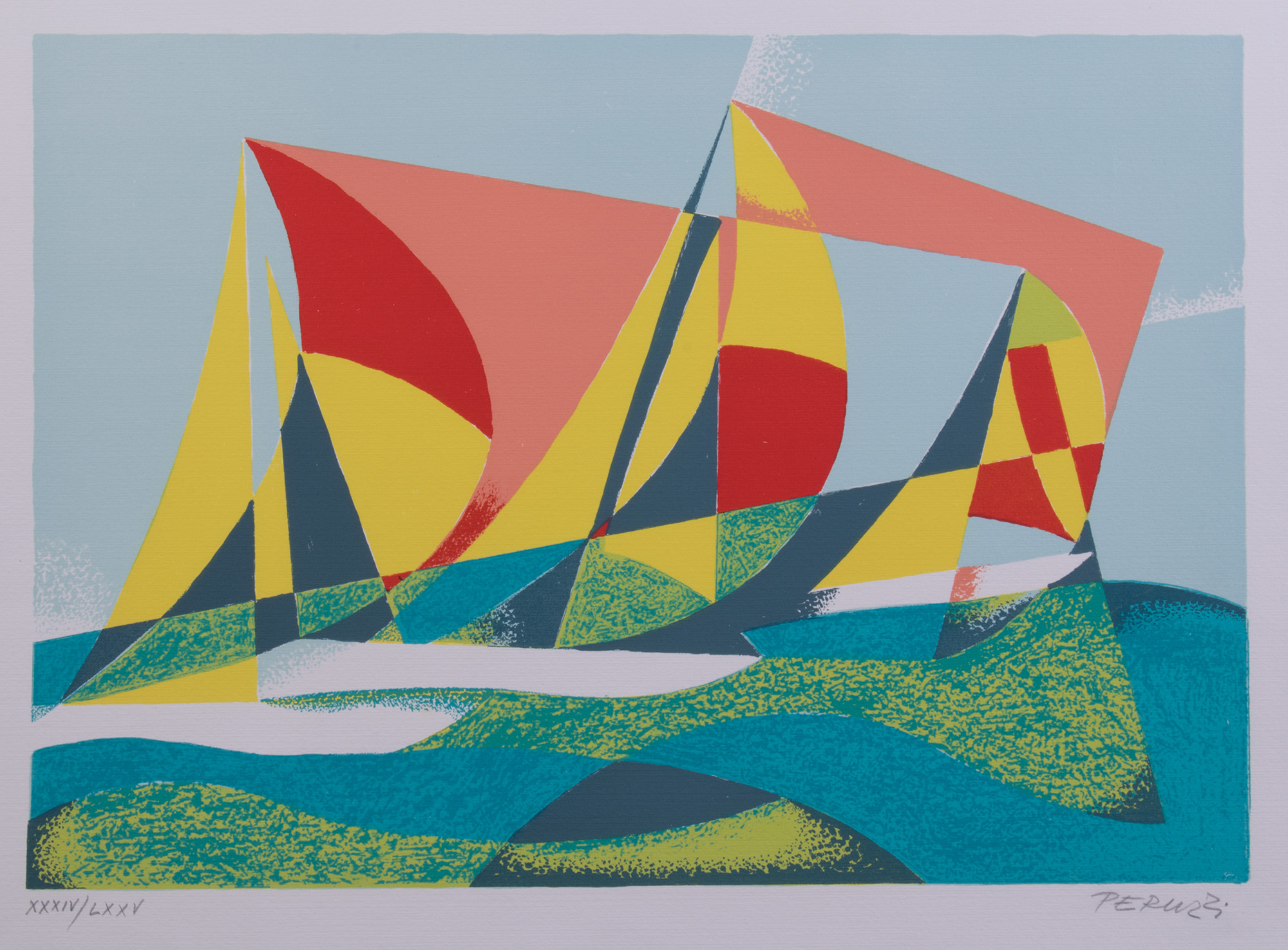 B) Osvaldo Peruzzi, Senza titolo, litografia a colori, es. XXXIV/LXXV, cm. 35,5x49,7 (lastra), cm. 49,3x70 (carta). Firma a matita sul margine in basso a destra: Peruzzi: timbro a secco Graphis Arte, Livorno, tiratura in basso a sinistra: XXXIV/LXXV.
