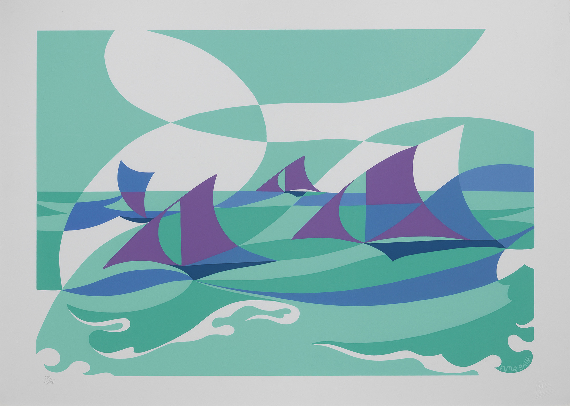 Firma in lastra in basso a destra: Futurballa, tiratura a matita sul margine in basso a sinistra: 204/250, timbro a secco in basso a destra: Area Studio.