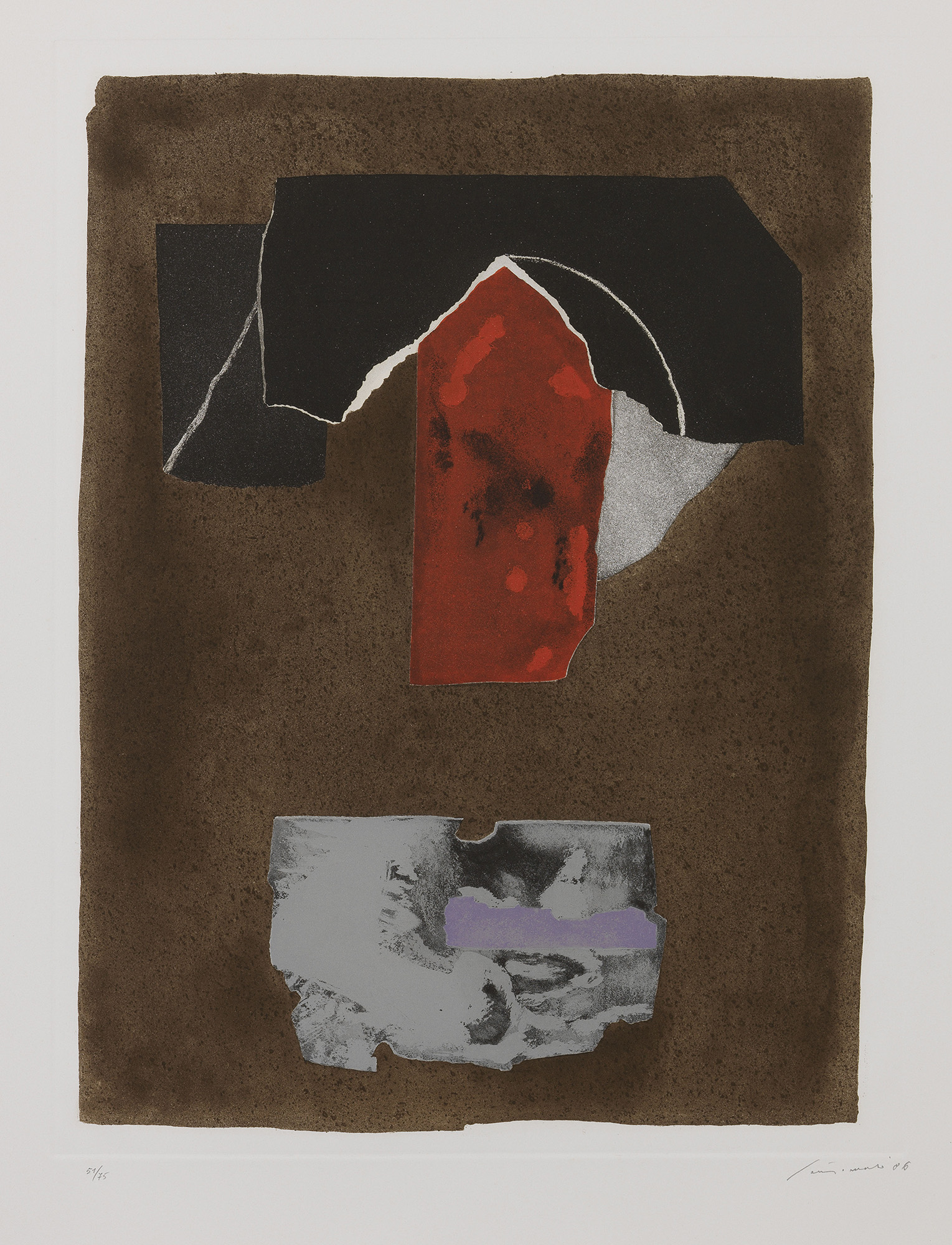 Firma e data a matita sul margine in basso a destra: Santomaso '86, tiratura in basso a sinistra: 54/75.