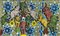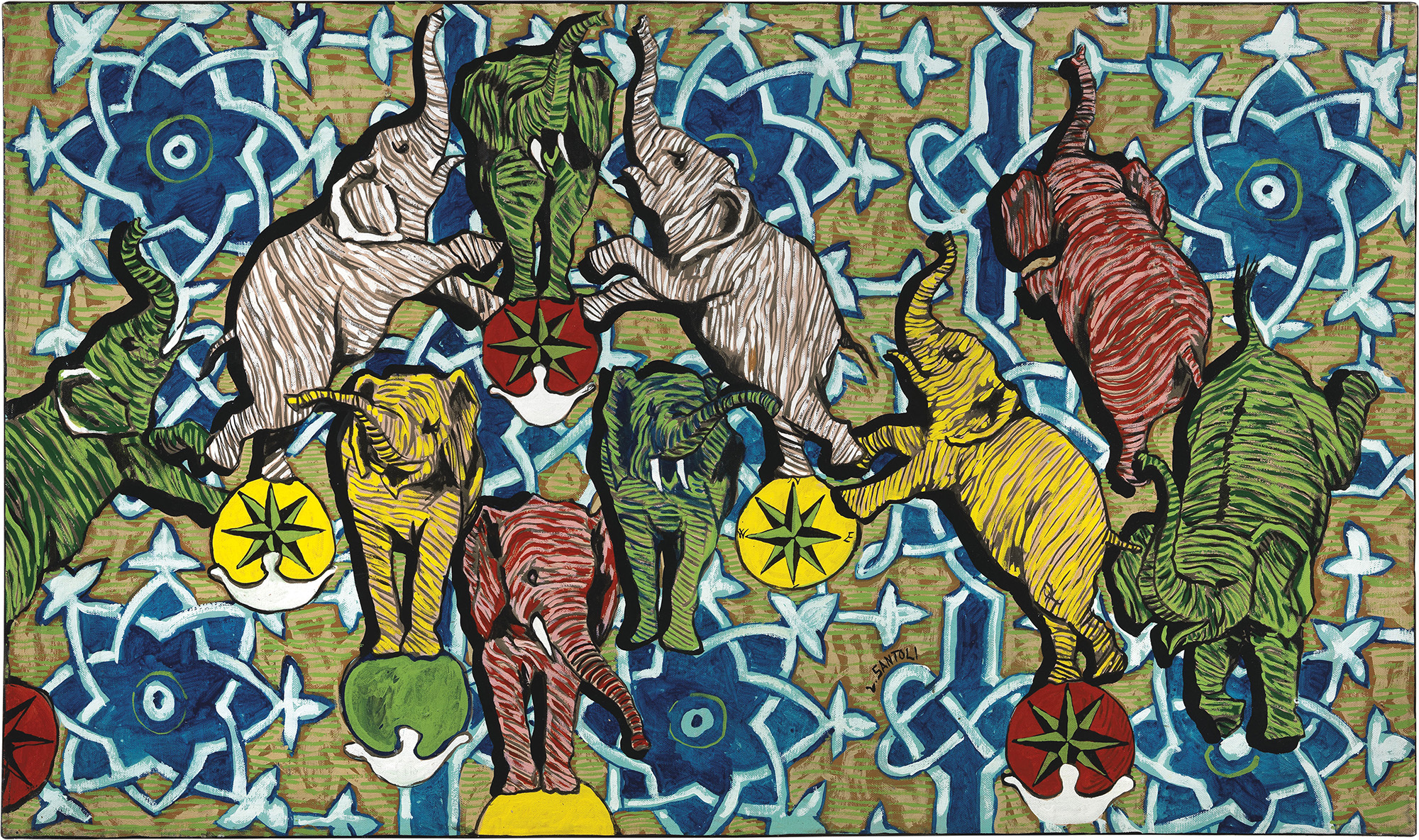 Firma in basso al centro: L. Santoli; firma, titolo e data al verso sulla tela: Leonardo Santoli / "Danza d'elefanti" / 2001: scritta con indicazione di pubblicazione Monografia Leonardo Santoli 2006 e Monografia Suite Italiana, Galleria l'Ariete, Bologna 2001.