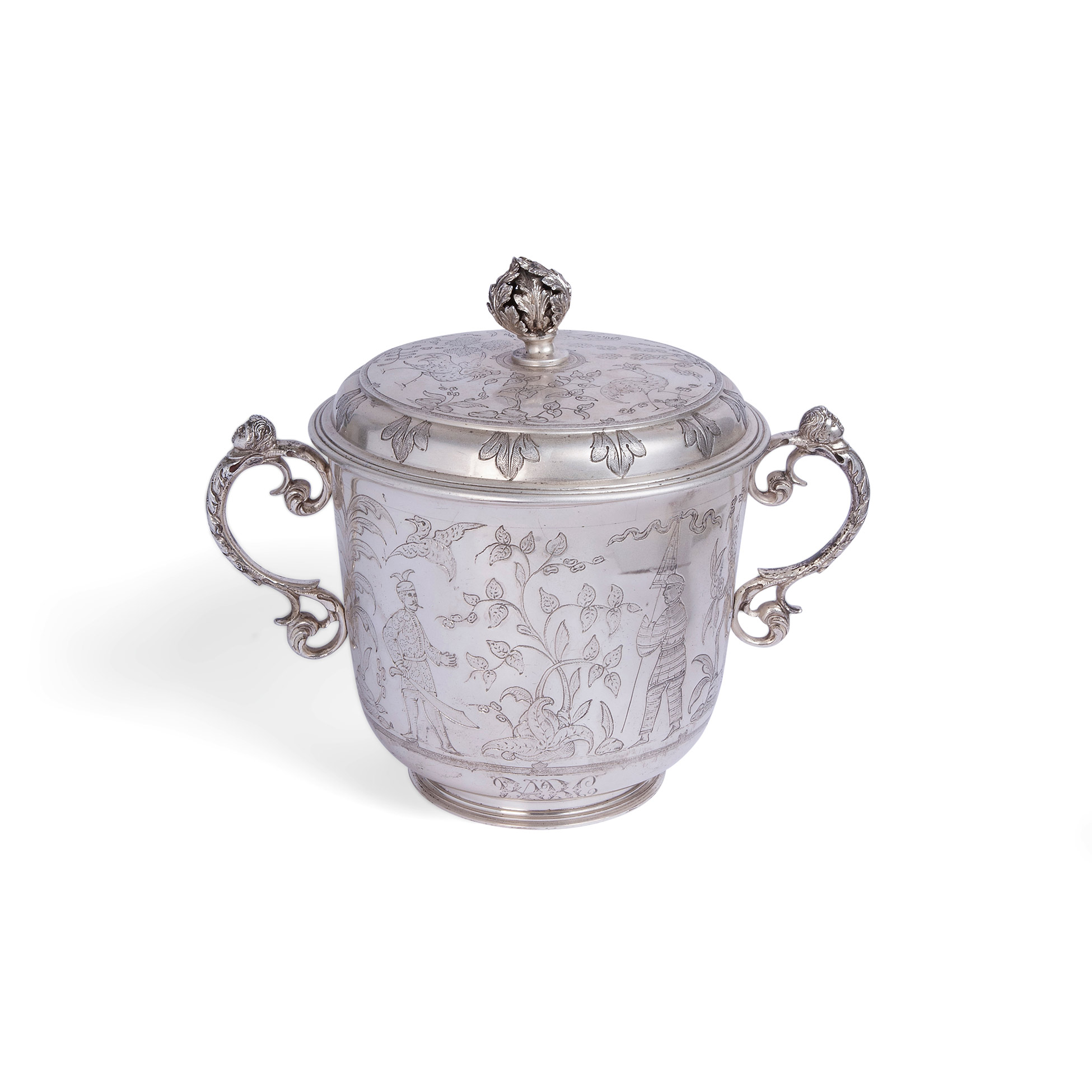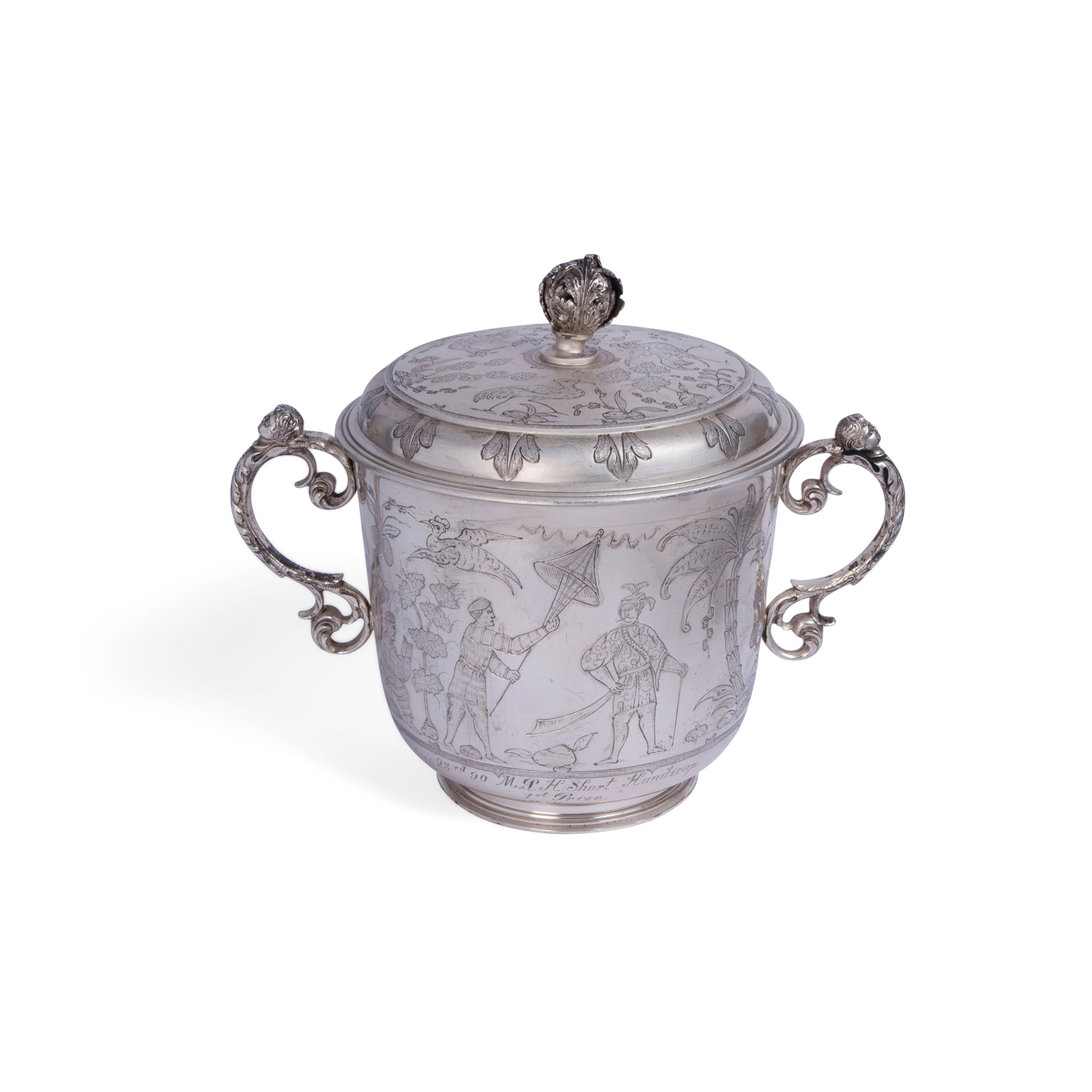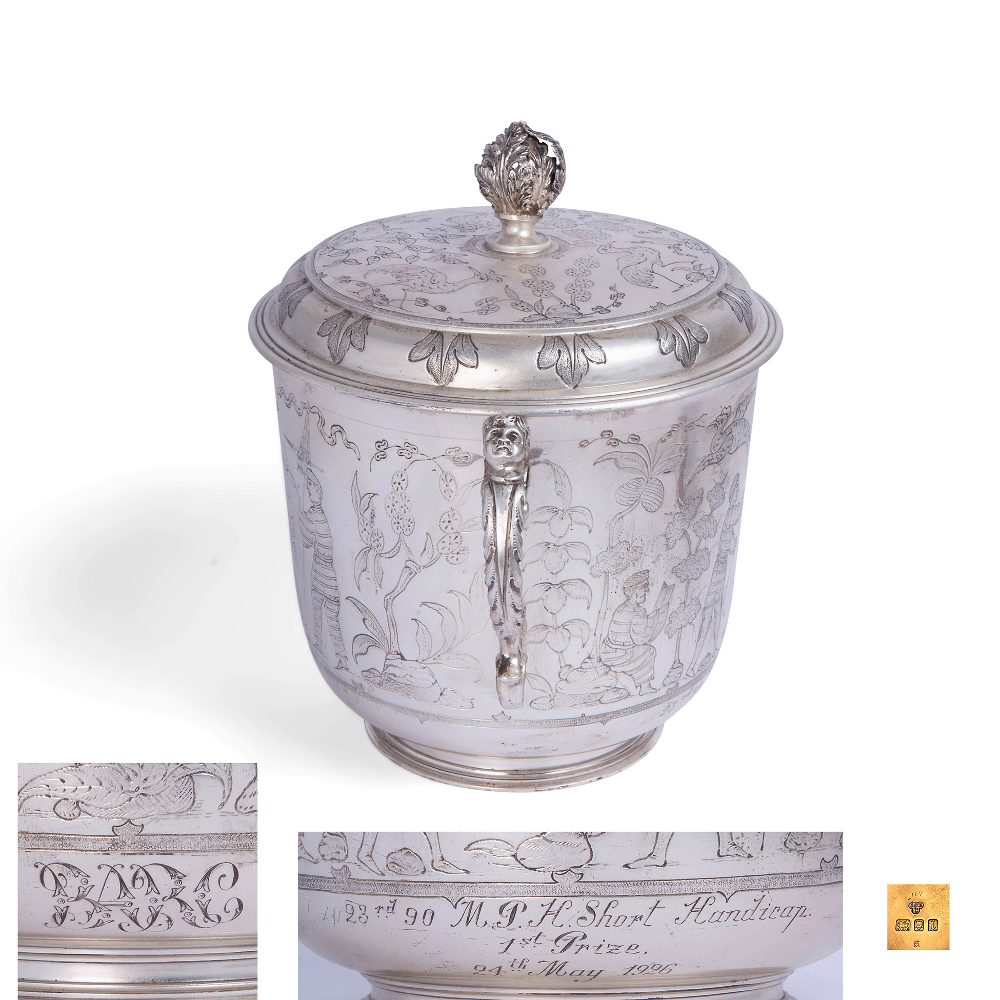 Coppa a due anse in argento, Londra 1924 Decorato con incisioni a chinoiserie Peso complessivo gr. 1343, 23x27,5x17 cm.