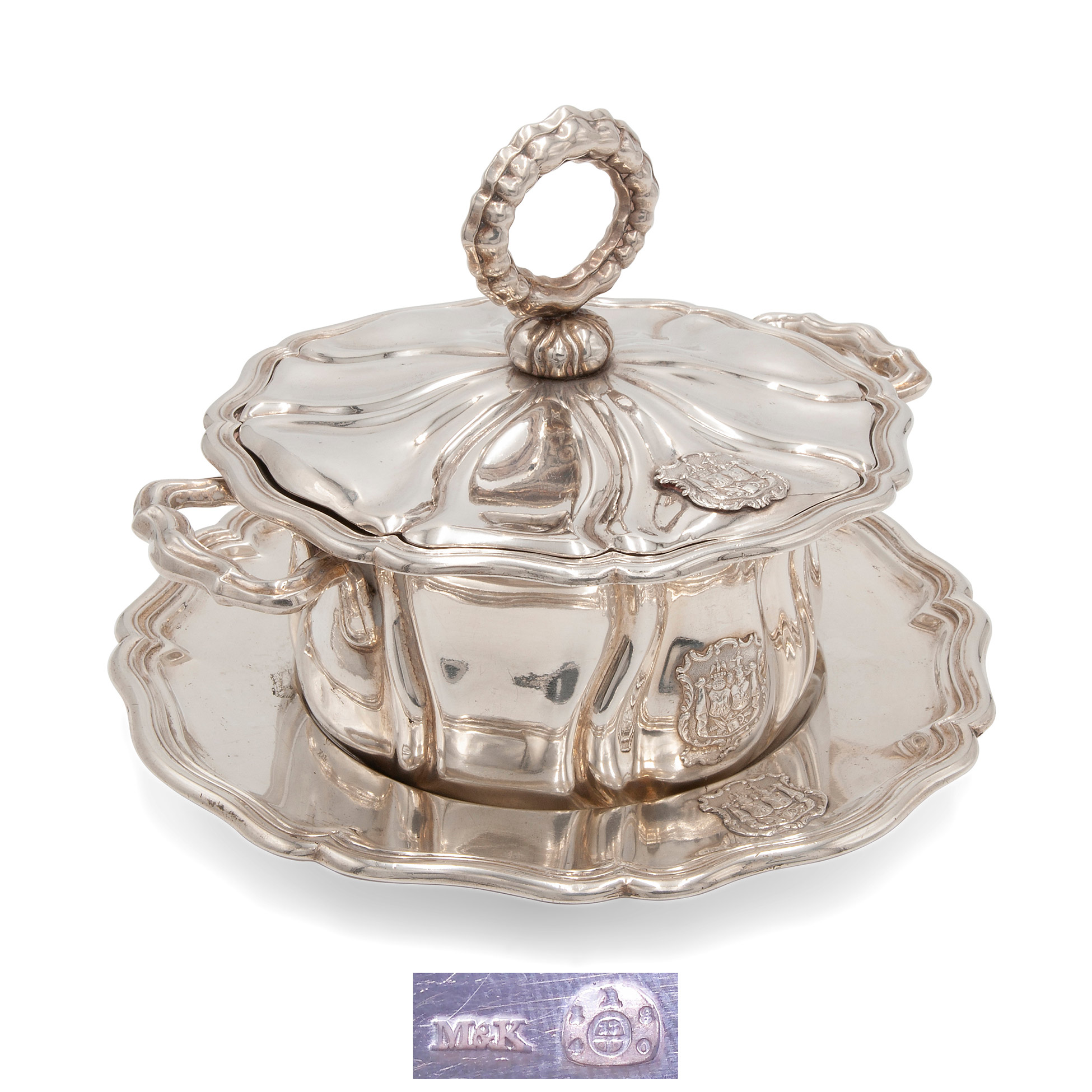 Zuppierina in argento con sottopiatto, Vienna 1840 Peso complessivo gr. 1204, 16,5x22x22 cm.