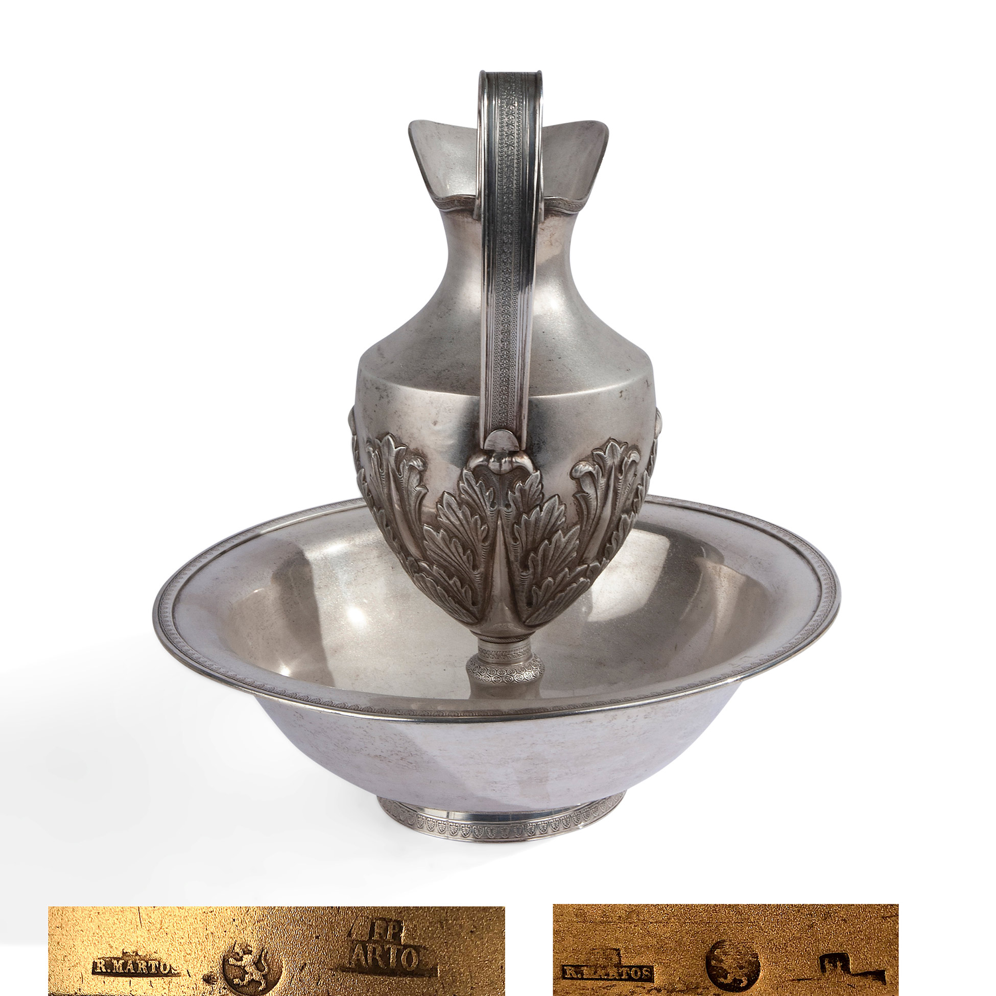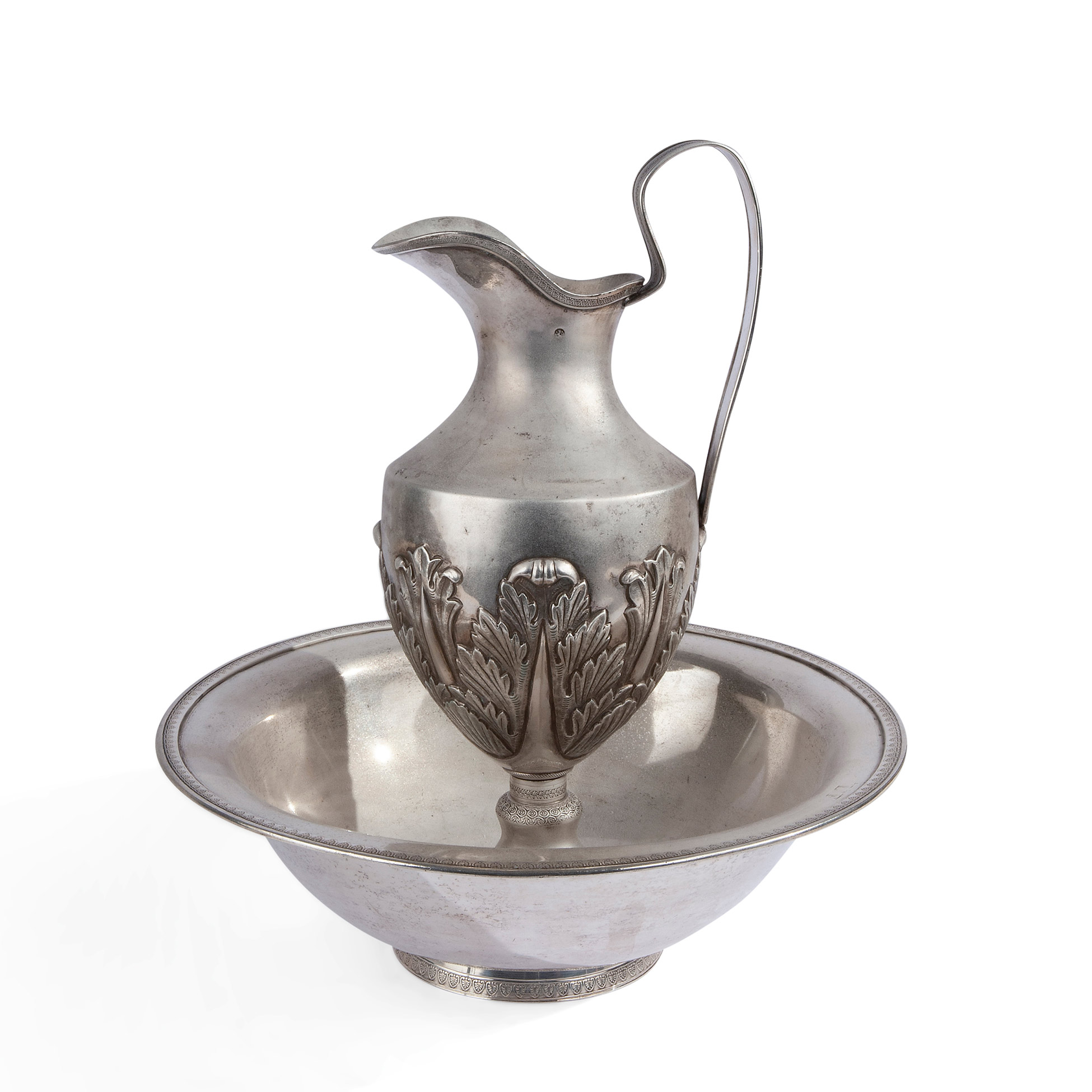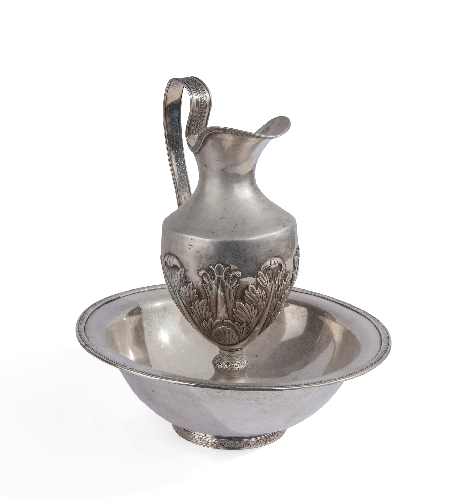 Caraffa e bacile in argento Manifattura spagnola del XIX secolo Peso complessivo gr. 2029, 36x31x31 cm.