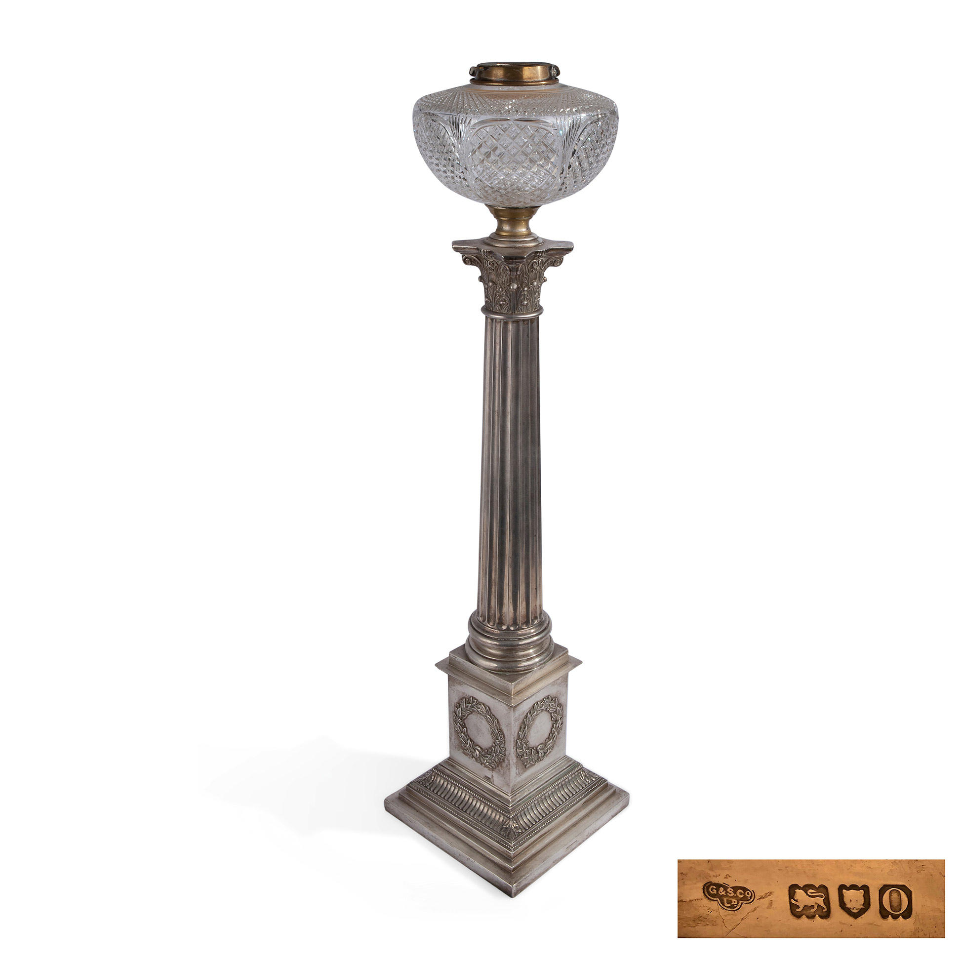 Modello di lampada a colonna in argento, Londra 1909 Con capitello corinzio, periodo Edoardo VII Dimensioni 68x16x16 cm.