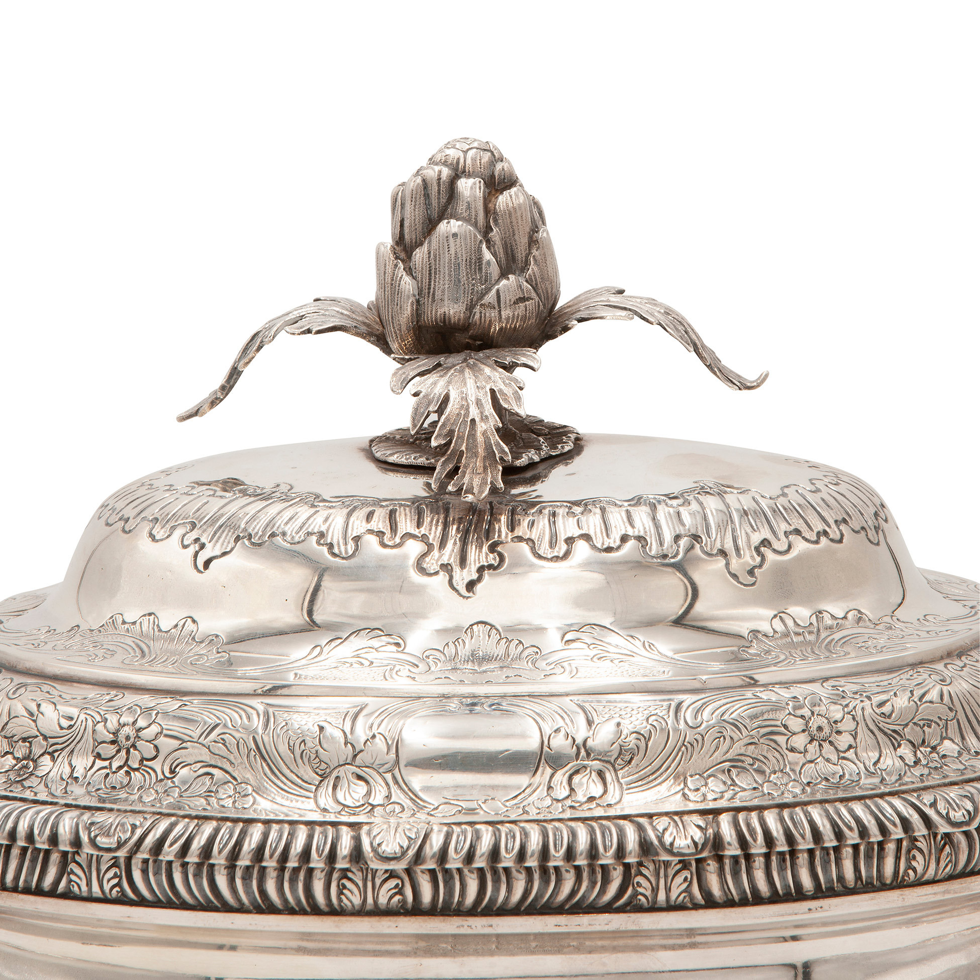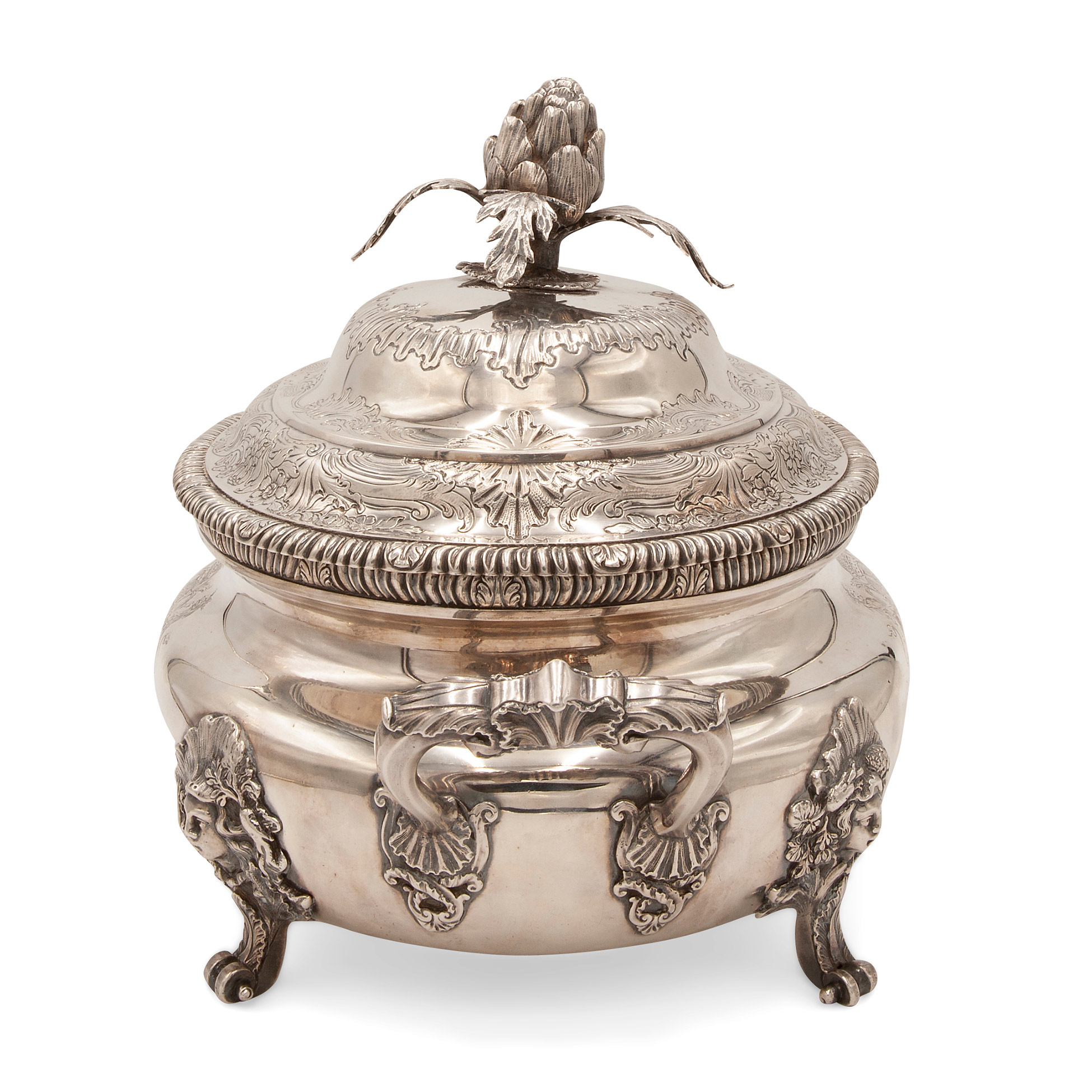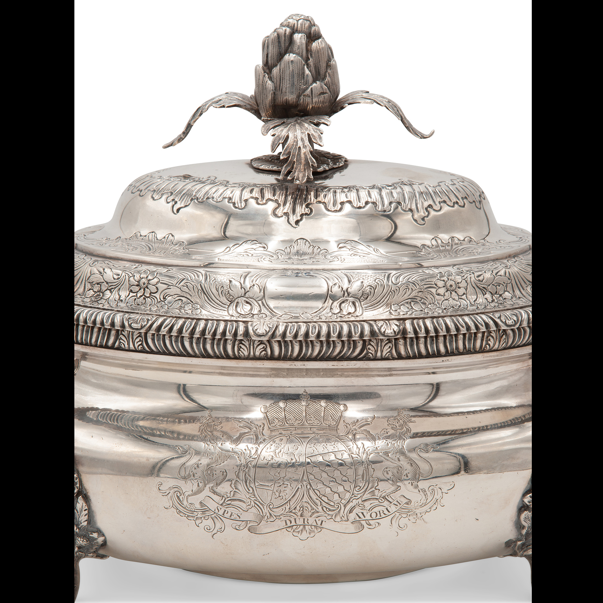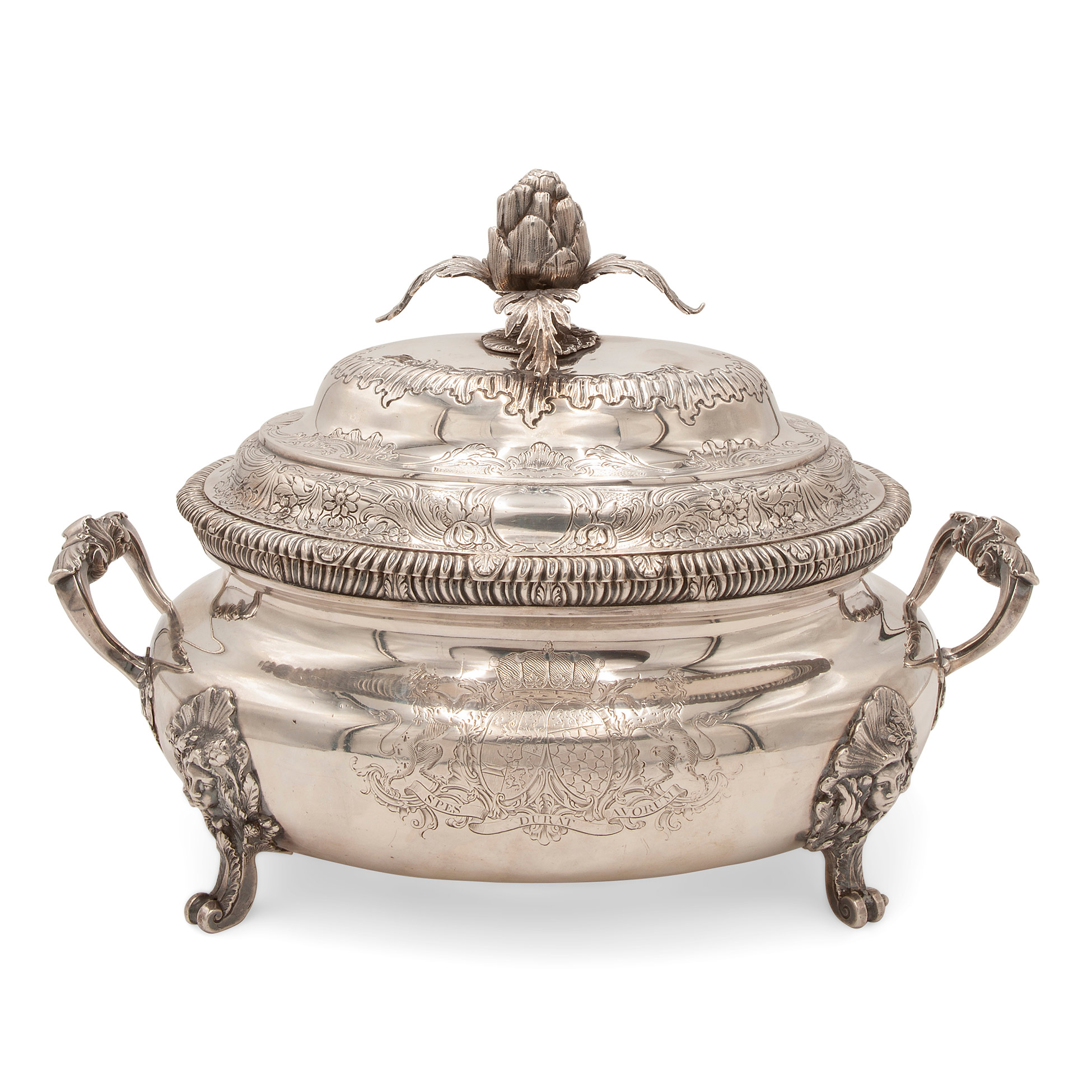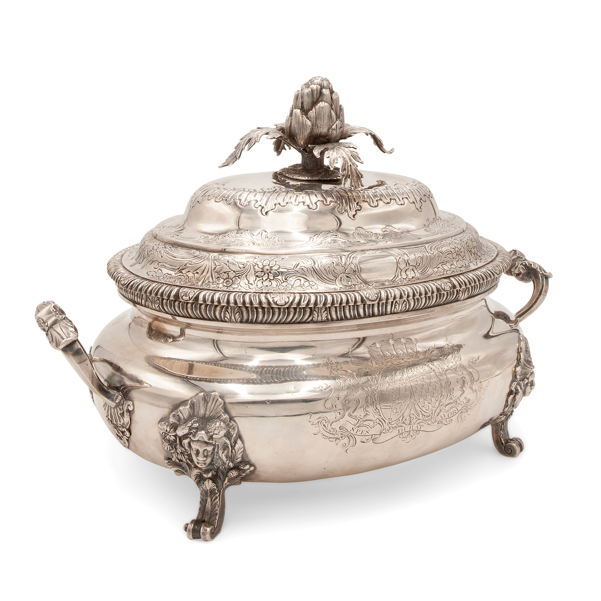 Grande zuppiera in argento, Londra 1755 Manifattura del periodo Giorgio II Peso complessivo gr. 3534, 28x39x22 cm.