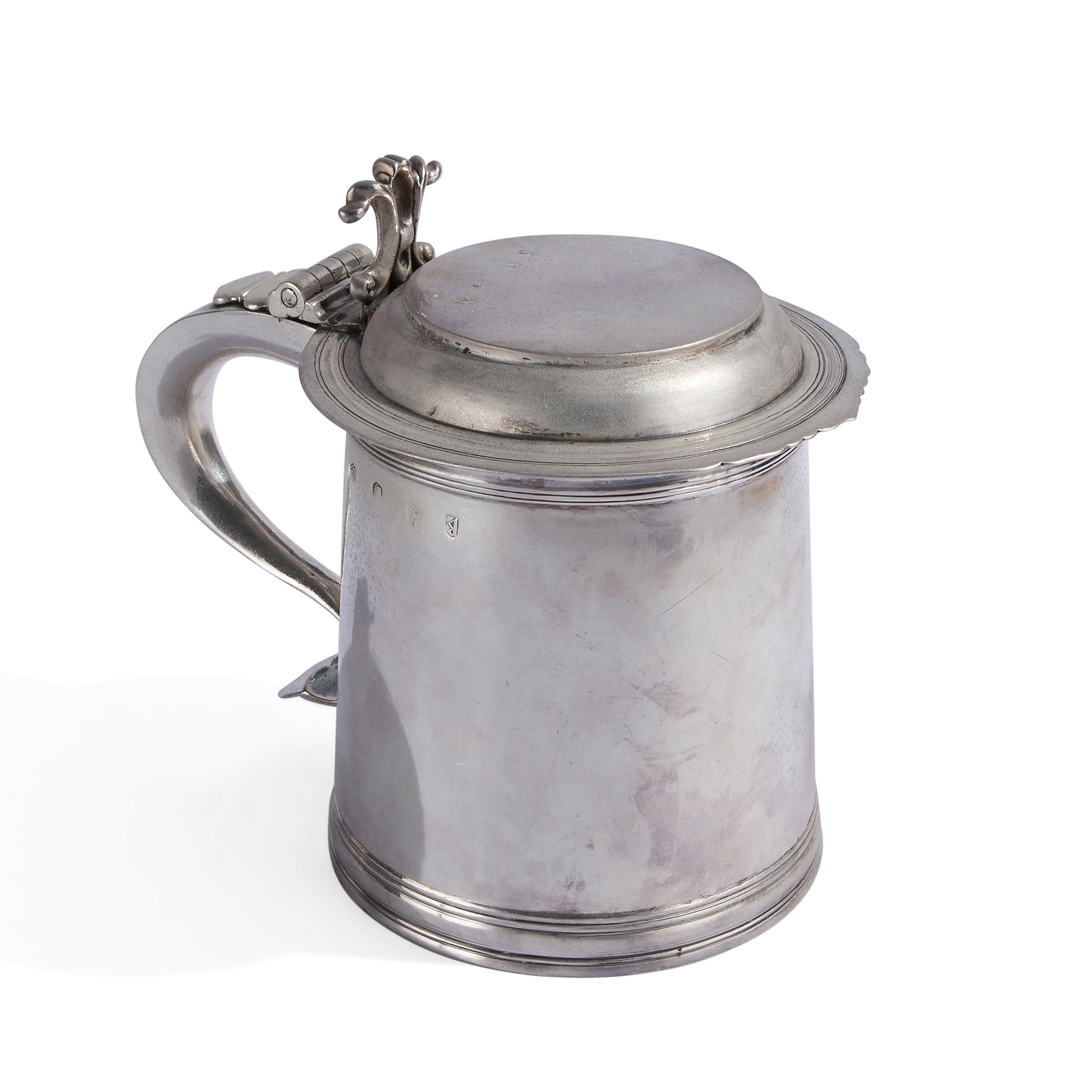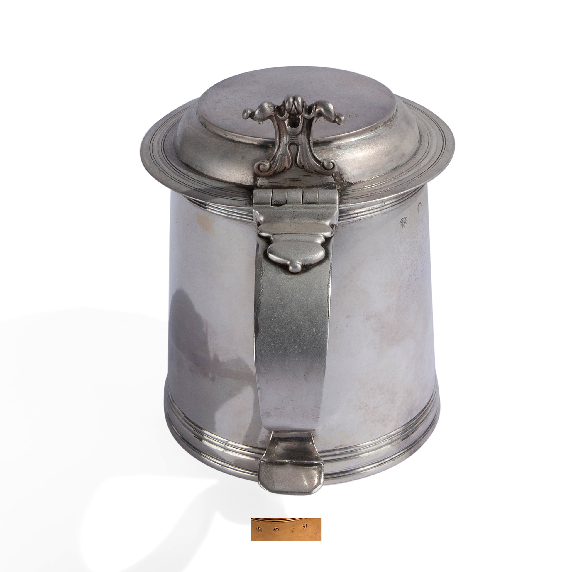 Flat top Tankard, Londra 1697 Timbri del maestro argentiere Chas. Overing Peso complessivo gr. 860, 17,5x21x14 cm.