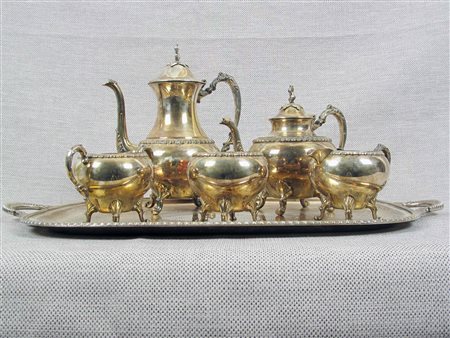 Servizio Sheffield, circa 1910 6 pezzi: assoio, caffettiera, teiera, lattiera, zuccherriera e zollettiera Misure vassoio 68x40,5 cm