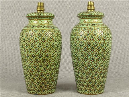 Coppia di portalampade in legno e carta pressata Inizio XX secolo Altezza 30 cm