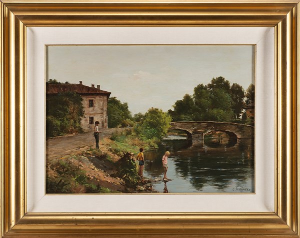 Lot 149 | Carlo Mezzadra "Ponte sul Naviglio Grande a Castelletto" olio su tela Firmato