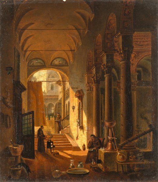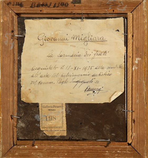 Giovanni Migliara "La farmacia dei frati" olio su tavola (cm 15,5x14) Al retro: