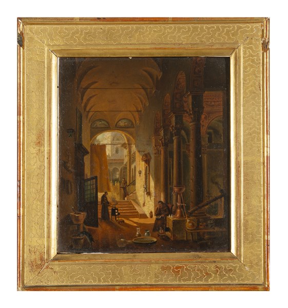 Lot 158 | Giovanni Migliara "La farmacia dei frati" olio su tavola (cm 15,5x14) Al retro: