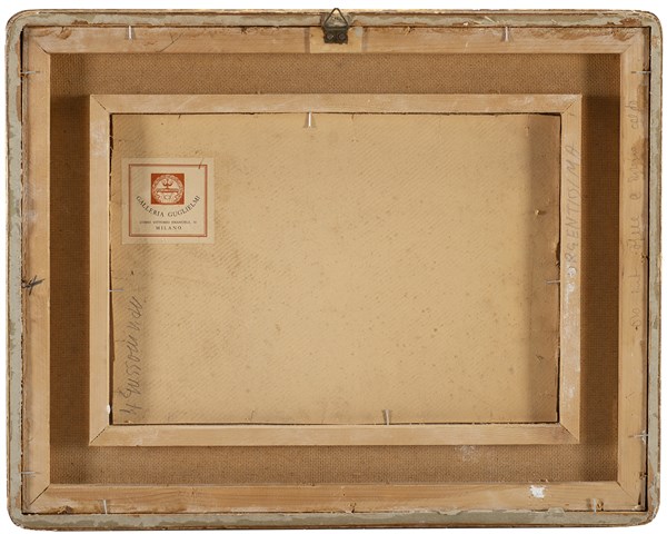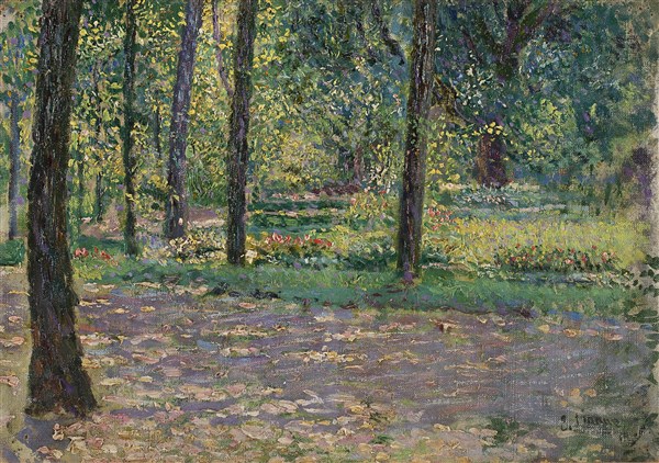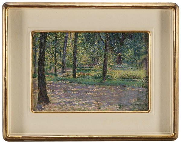 Enrico Lionne "Il parco" olio su tela applicata a cartone (cm 23,5x34) Firmato