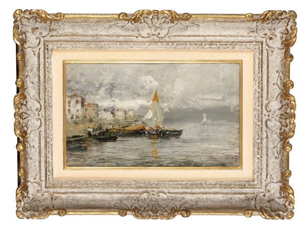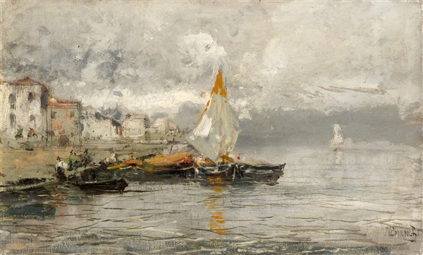 Mosè Bianchi "Marina a Chioggia" olio su compensato (cm 29,5x48,5)Firmato in basso