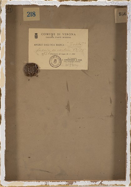 Al retro: cartiglio e timbro a ceralacca della Galleria d'Arte Moderna di Verona firmato dal prof.Antonio Avena
