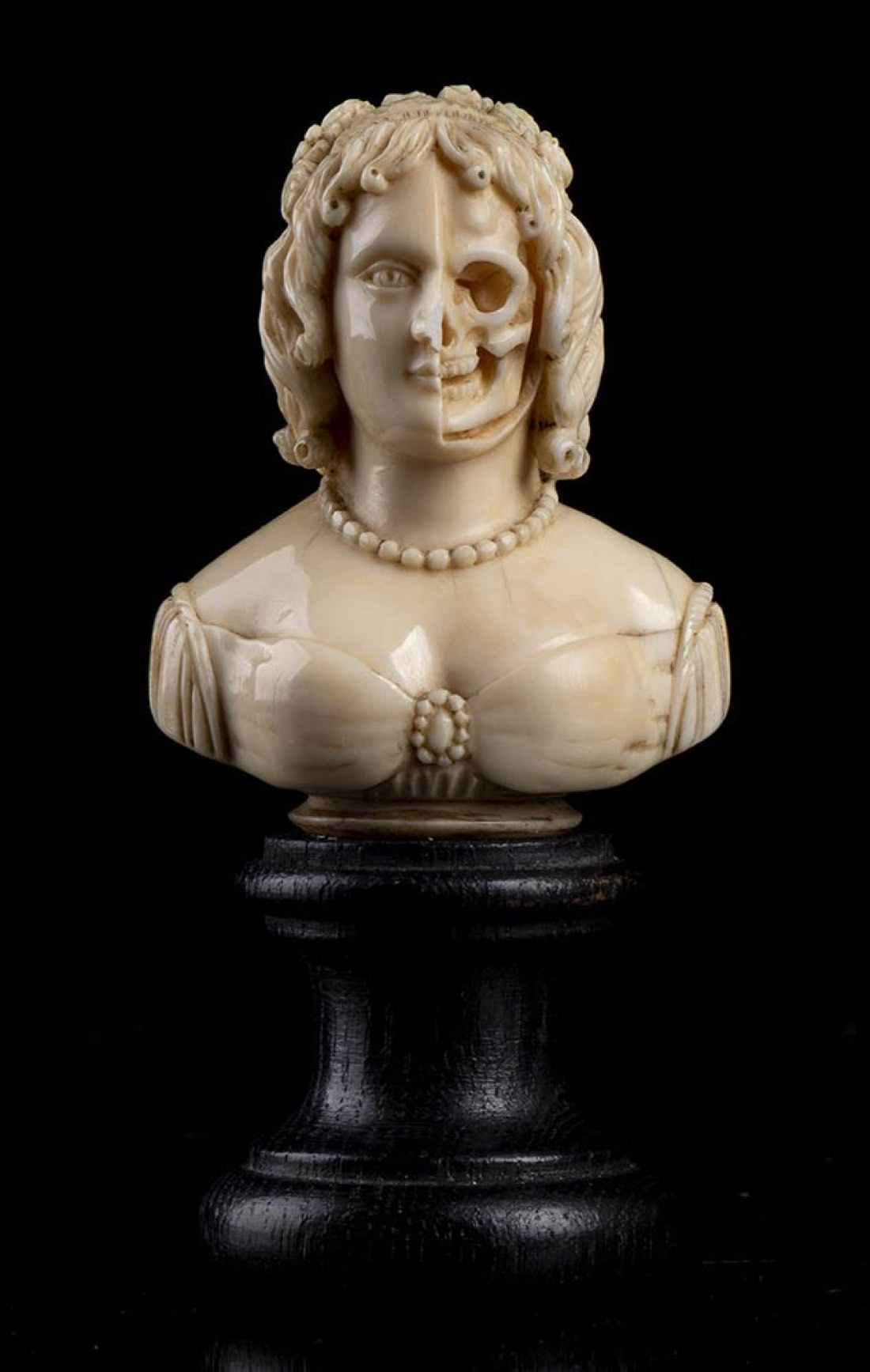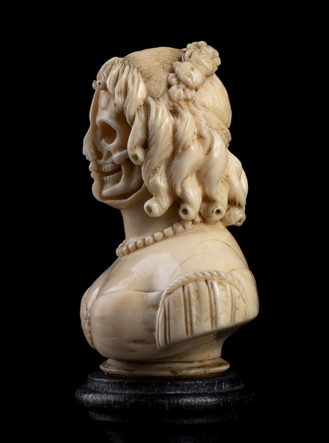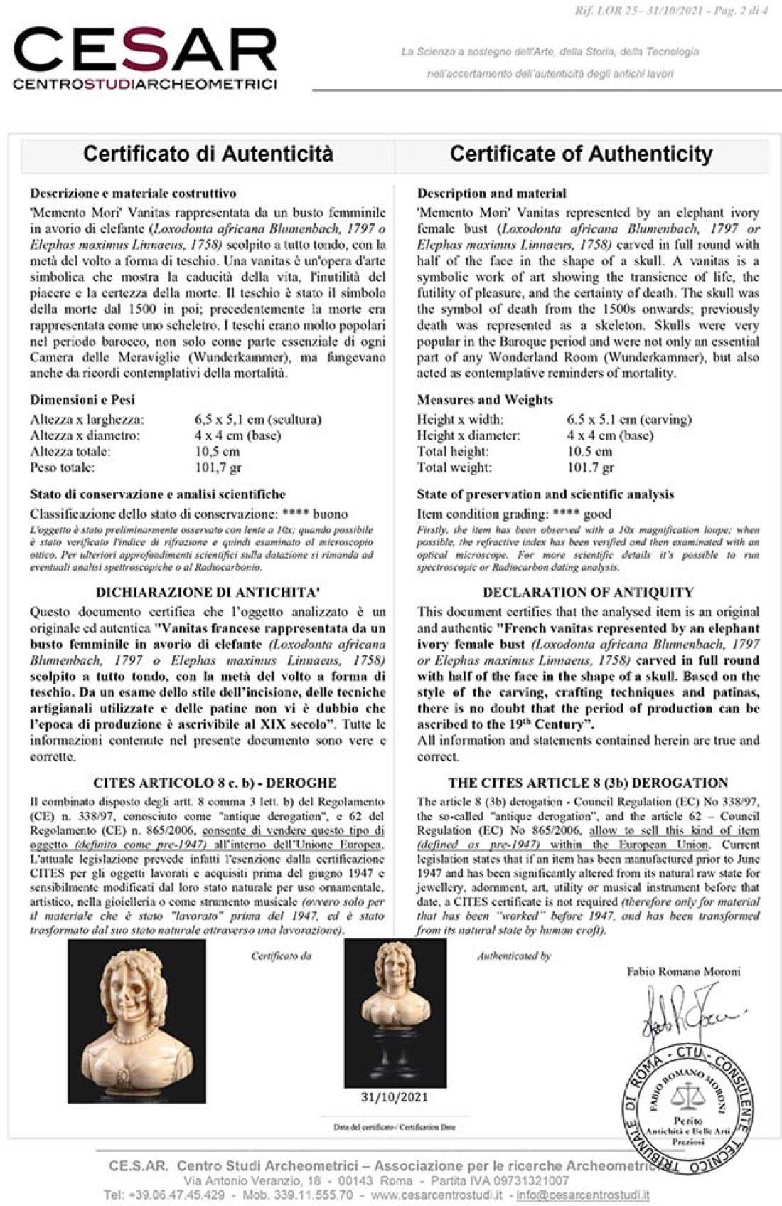 "Memento Mori" Vanitas rappresentata da un busto femminile in avorio di elefante (Loxodonta africana Blumenbach, 1797 o Elephas maximus Linnaeus, 1758) scolpito a tutto tondo, con la metà del volto a forma di teschio. Una vanitas è un'opera d'arte simbolica che mostra la caducità della vita, l'inutilità del piacere e la certezza della morte. Il teschio è stato il simbolo della morte dal 1500 in poi; precedentemente la morte era rappresentata come uno scheletro. I teschi erano molto popolari nel periodo barocco, non solo come parte essenziale di ogni Camera delle Meraviglie (Wunderkammer), ma fungevano anche da ricordi contemplativi della mortalità. Altezza x larghezza 6,5 x 5,1 cm (scultura); altezza x diametro 4 x 4 cm (base); altezza totale 10,5 cm. Peso totale 101,7 gr. Stato di conservazione: **** buono. Accompagnato da certificato di autenticità Ce.S.Ar. Centro Studi Archeometrici (pre-1947).