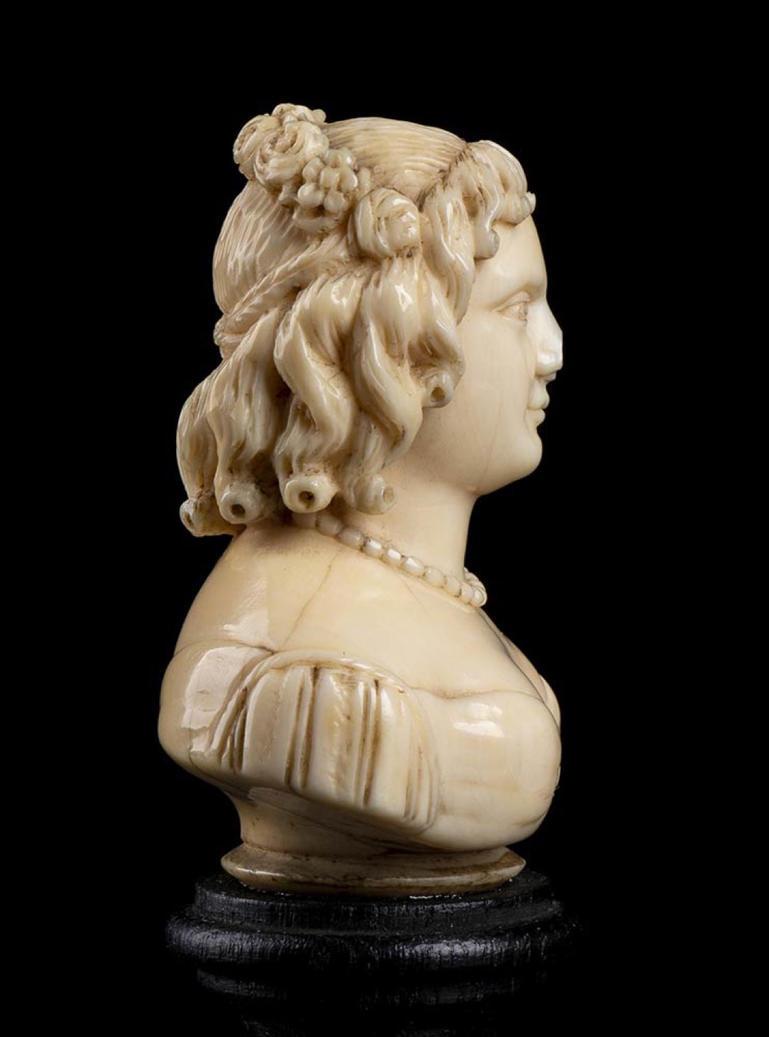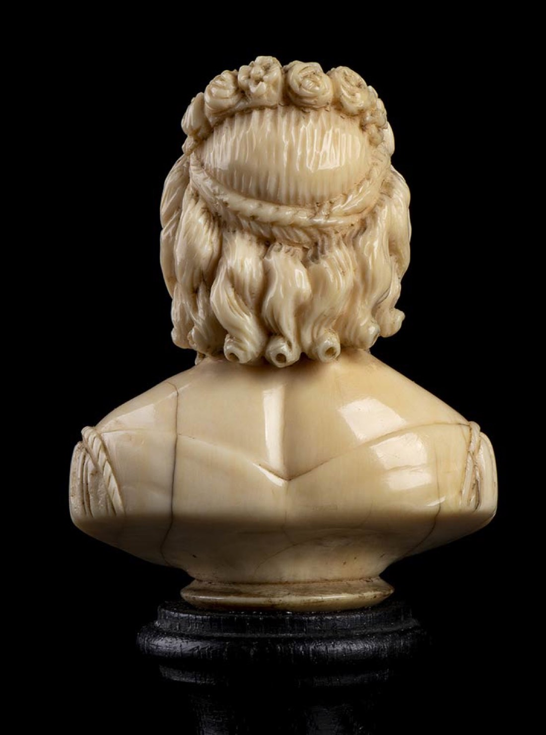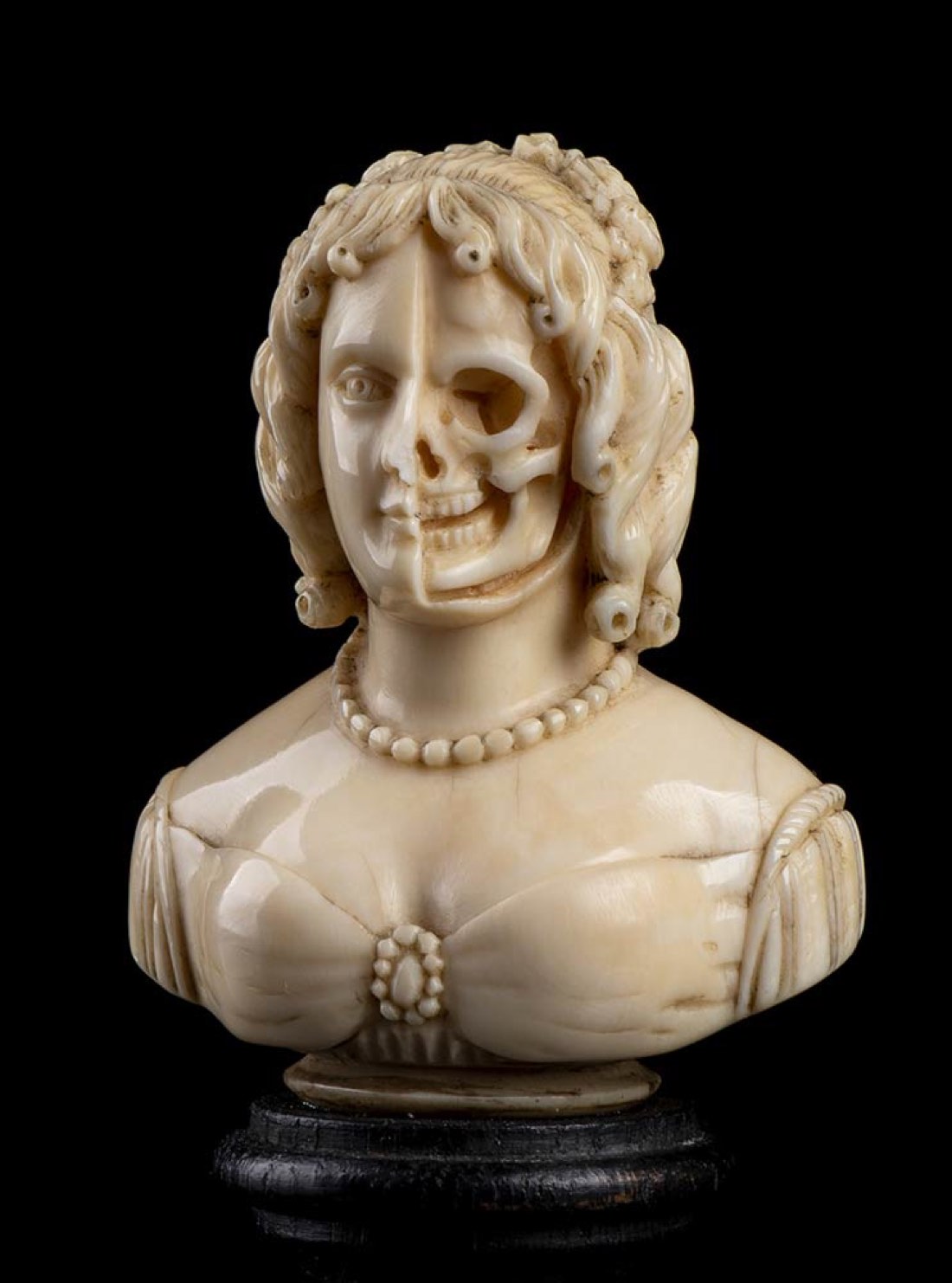 "Memento Mori" Vanitas rappresentata da un busto femminile in avorio di elefante (Loxodonta africana Blumenbach, 1797 o Elephas maximus Linnaeus, 1758) scolpito a tutto tondo, con la metà del volto a forma di teschio. Una vanitas è un'opera d'arte simbolica che mostra la caducità della vita, l'inutilità del piacere e la certezza della morte. Il teschio è stato il simbolo della morte dal 1500 in poi; precedentemente la morte era rappresentata come uno scheletro. I teschi erano molto popolari nel periodo barocco, non solo come parte essenziale di ogni Camera delle Meraviglie (Wunderkammer), ma fungevano anche da ricordi contemplativi della mortalità. Altezza x larghezza 6,5 x 5,1 cm (scultura); altezza x diametro 4 x 4 cm (base); altezza totale 10,5 cm. Peso totale 101,7 gr. Stato di conservazione: **** buono. Accompagnato da certificato di autenticità Ce.S.Ar. Centro Studi Archeometrici (pre-1947).