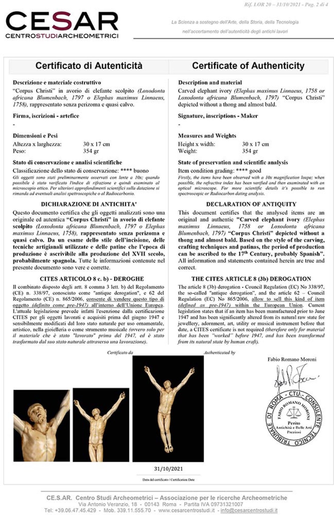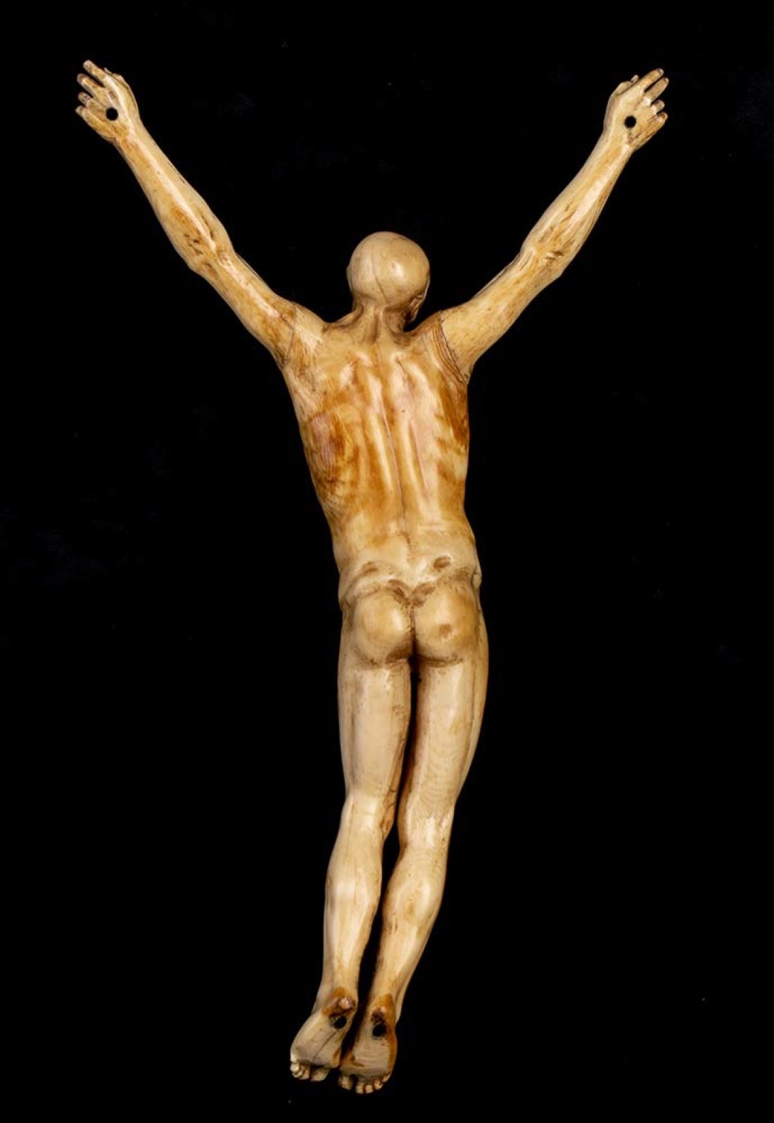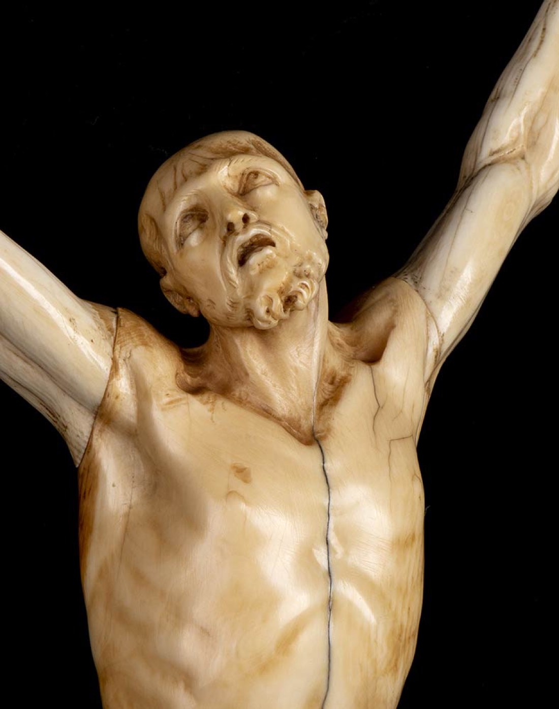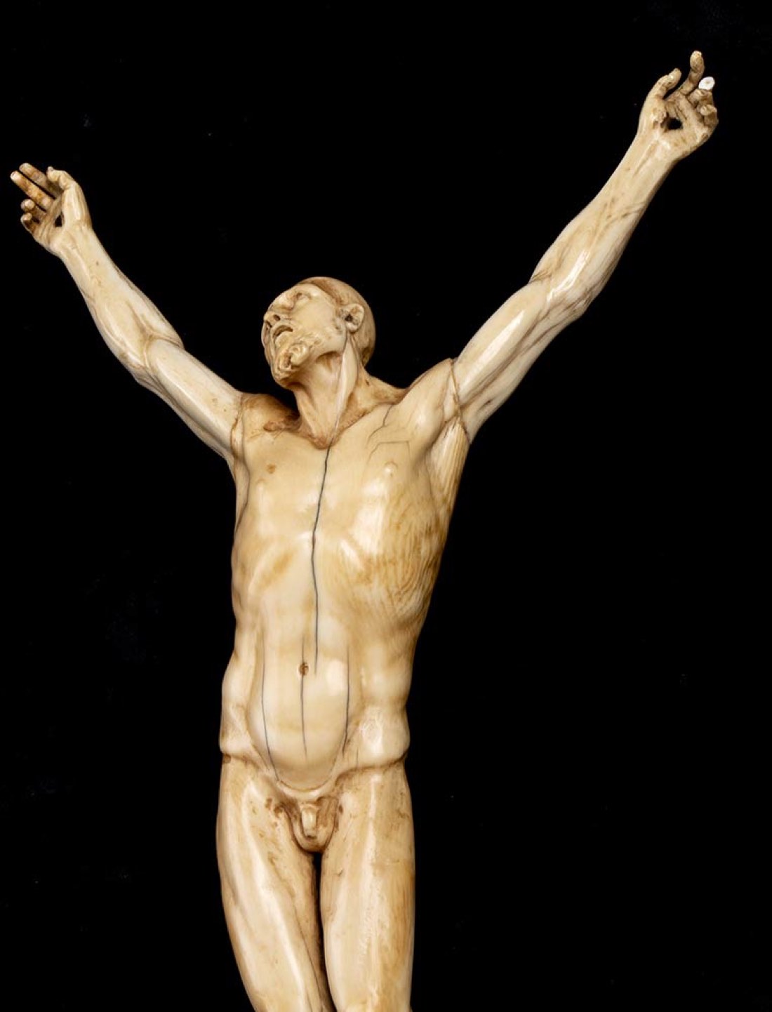 “Corpus Christi” in avorio di elefante scolpito (Loxodonta africana Blumenbach, 1797 o Elephas maximus Linnaeus, 1758), rappresentato senza perizoma e quasi calvo. Altezza x larghezza 30 x 17 cm. Peso 354 gr. Stato di conservazione: **** buono. Accompagnato da certificato di autenticità Ce.S.Ar. Centro Studi Archeometrici (pre-1947).