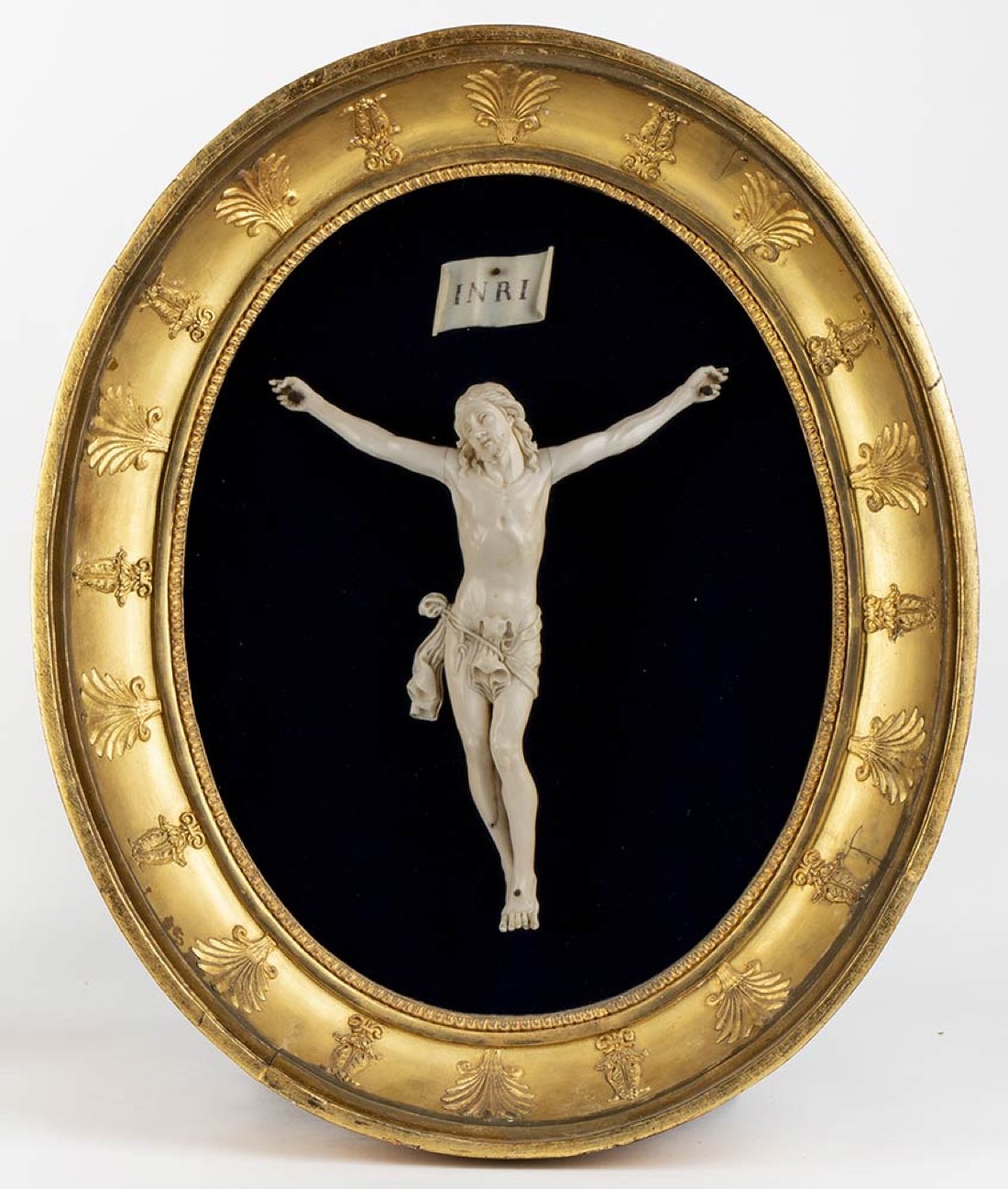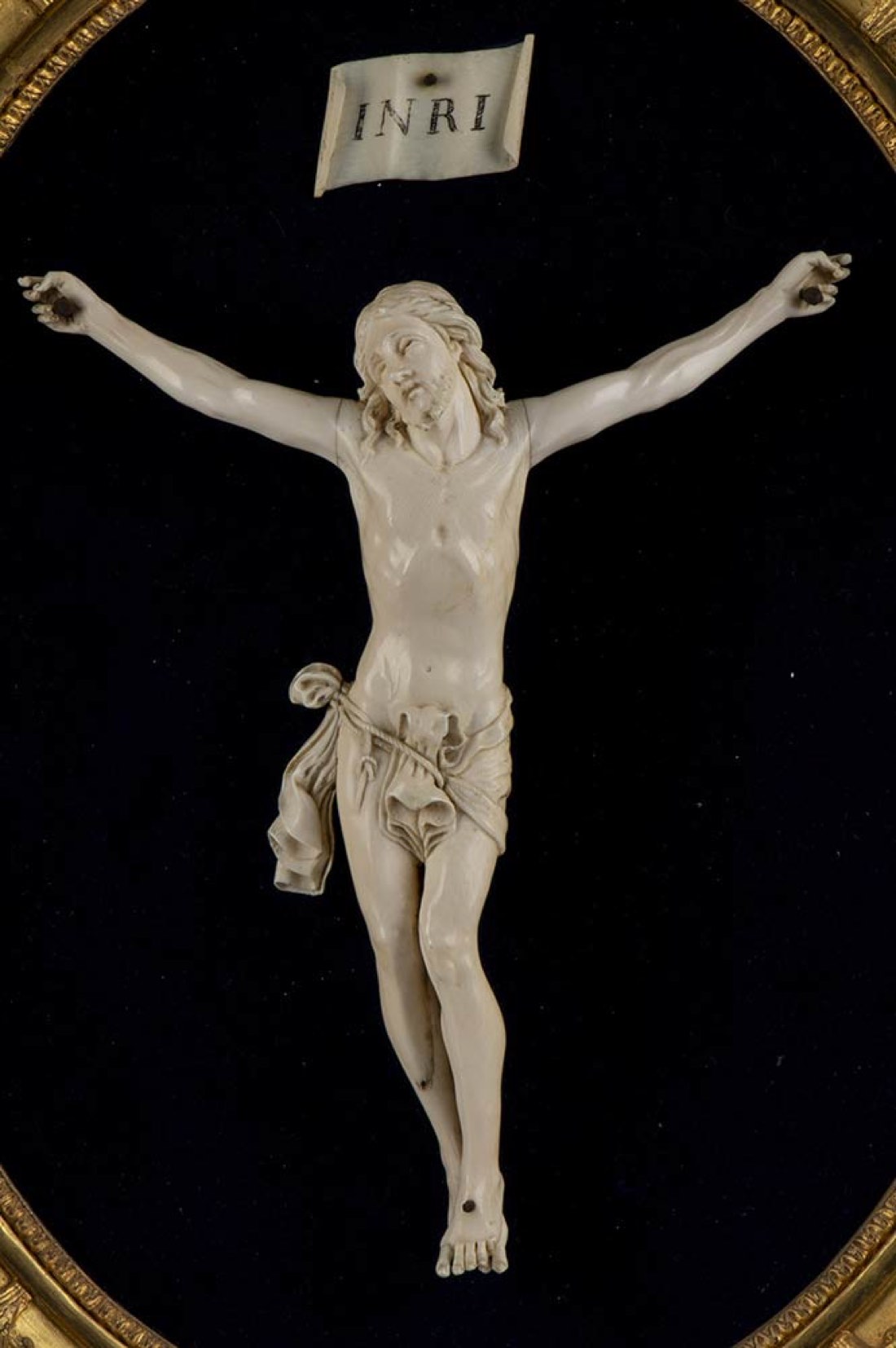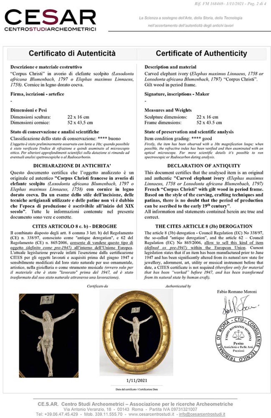“Corpus Christi” in avorio di elefante scolpito (Loxodonta africana Blumenbach, 1797 o Elephas maximus Linnaeus, 1758). Cornice in legno dorato coeva. Dimensioni scultura 22 x 16 cm, dimensioni cornice 52 x 43,5 cm. Stato di conservazione: **** buono. Accompagnato da certificato di autenticità Ce.S.Ar. Centro Studi Archeometrici (pre-1947).