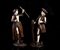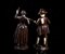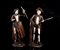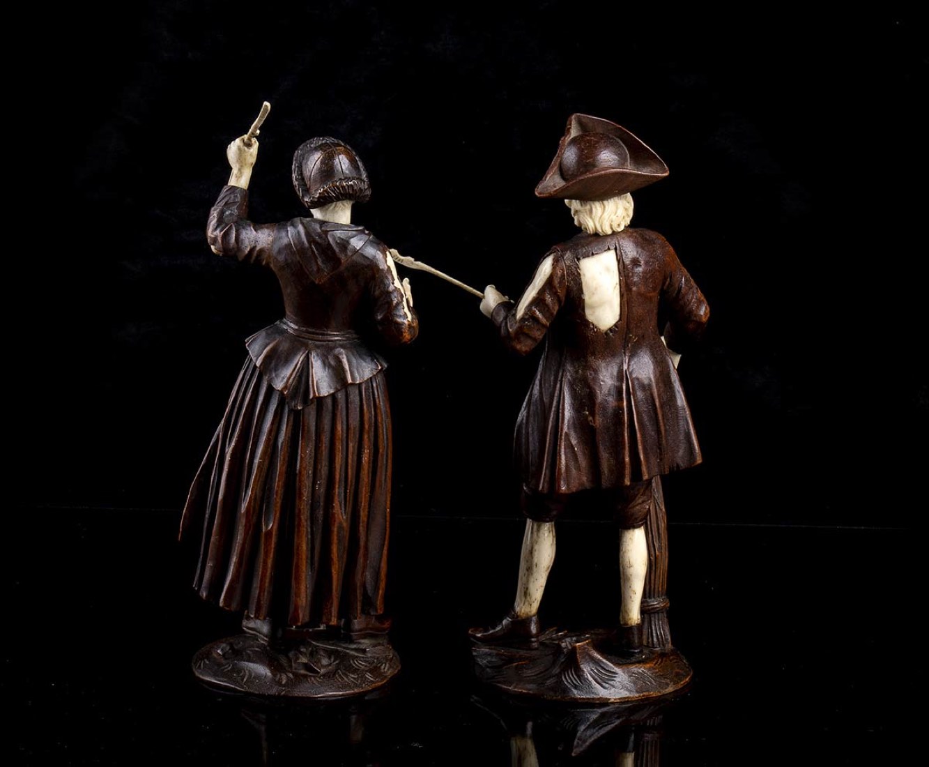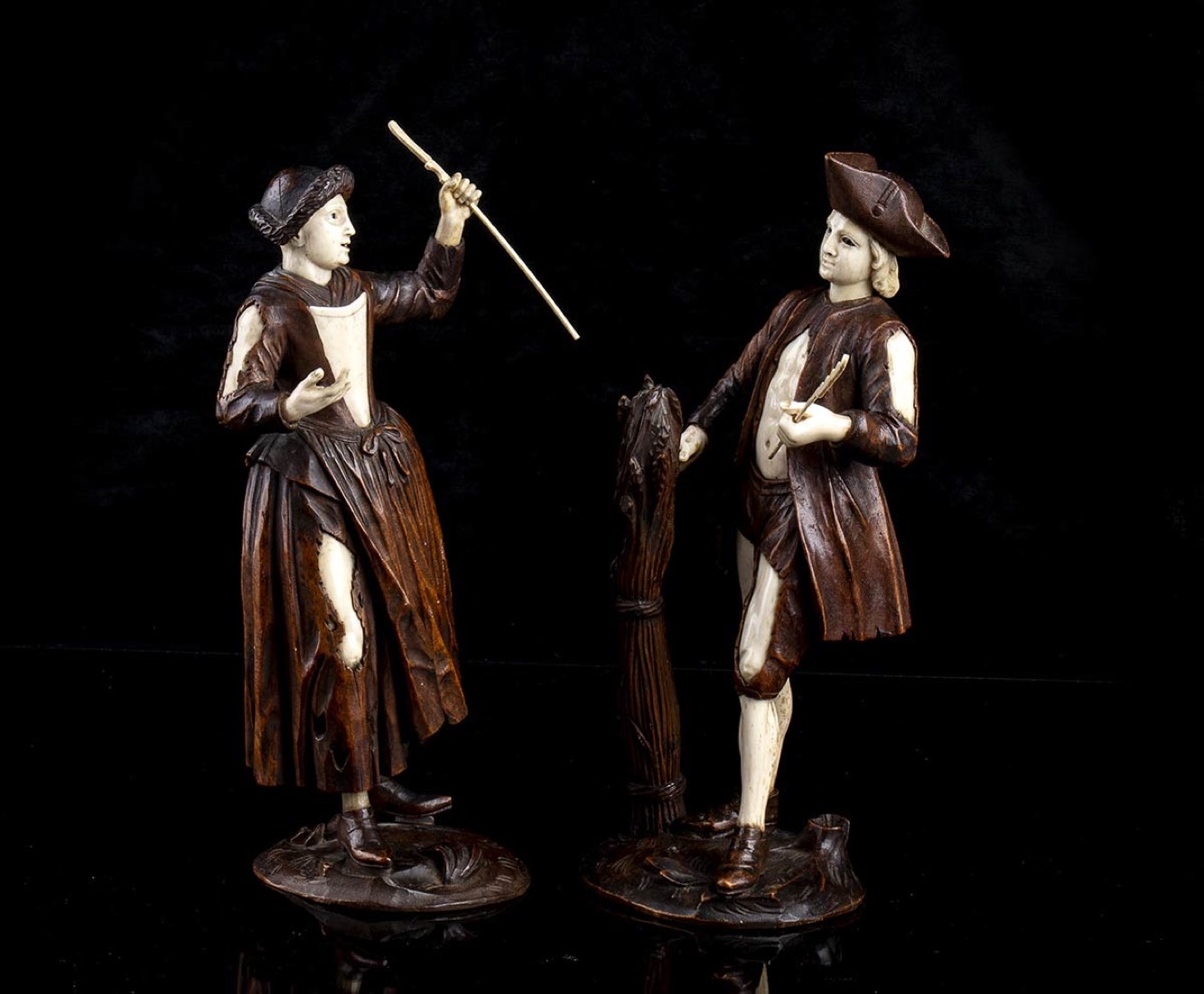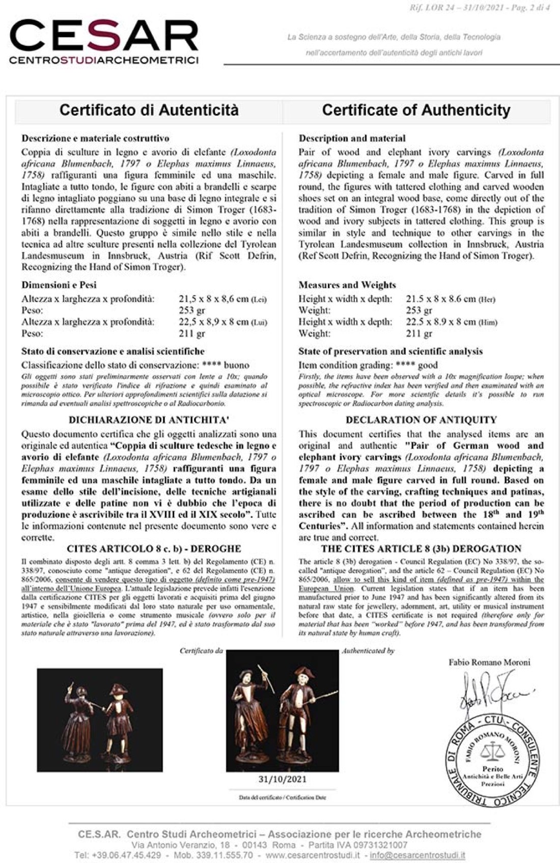in legno e avorio di elefante (Loxodonta africana Blumenbach, 1797 o Elephas maximus Linnaeus, 1758) raffiguranti una figura femminile ed una maschile. Intagliate a tutto tondo, le figure con abiti a brandelli e scarpe di legno intagliato poggiano su una base di legno integrale e si rifanno direttamente alla tradizione di Simon Troger (1683-1768) nella rappresentazione di soggetti in legno e avorio con abiti a brandelli. Questo lotto è simile nello stile e nella tecnica ad altre sculture presenti nella collezione del Tyrolean Landesmuseum in Innsbruck, Austria (Rif Scott Defrin, Recognizing the Hand of Simon Troger - Tiroler Landesmuseum Ferdinandeum, Innsbruck). Lei: altezza x larghezza x profondità 21,5 x 8 x 8,6 cm; peso 253 gr. Lui: altezza x larghezza x profondità 22,5 x 8,9 x 8 cm; peso 211 gr. Stato di conservazione: **** buono. Accompagnato da certificato di autenticità Ce.S.Ar. Centro Studi Archeometrici (pre-1947).