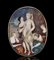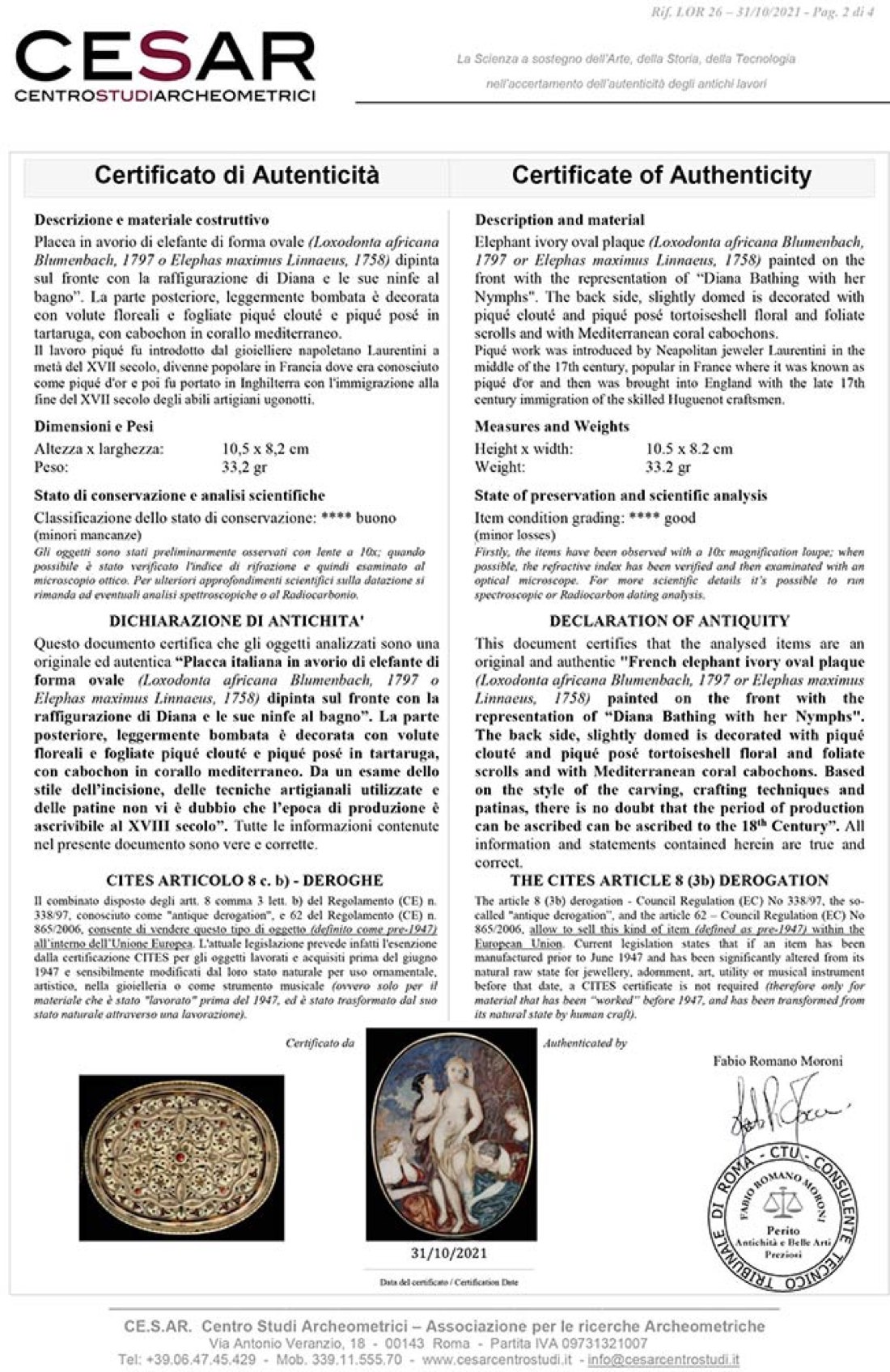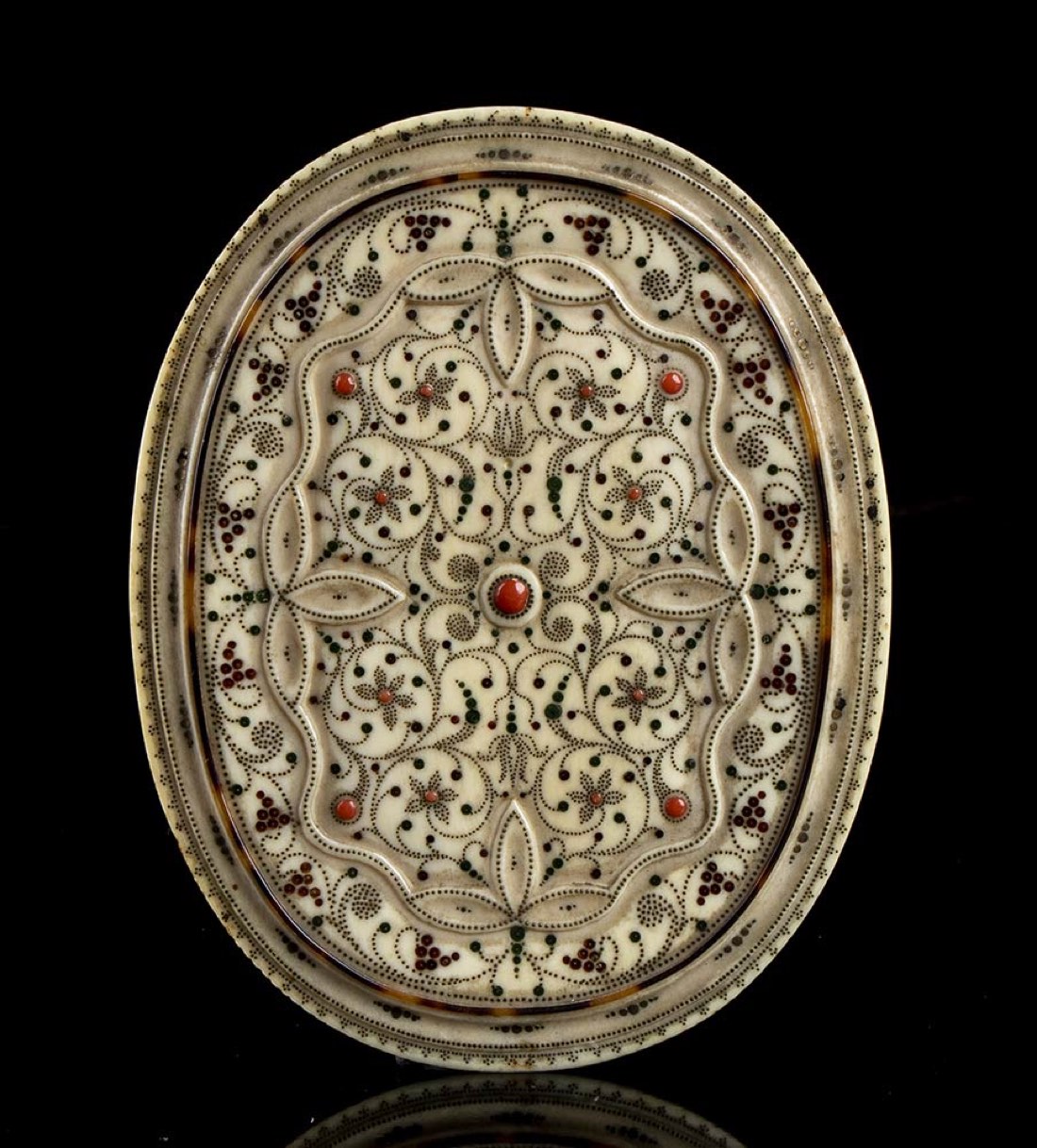 in avorio di elefante, di forma ovale (Loxodonta africana Blumenbach, 1797 o Elephas maximus Linnaeus, 1758), dipinta sul fronte con la raffigurazione di "Diana e le sue ninfe al bagno”. La parte posteriore, leggermente bombata è decorata con volute floreali e fogliate piqué clouté e piqué posé in tartaruga, con cabochon in corallo mediterraneo.