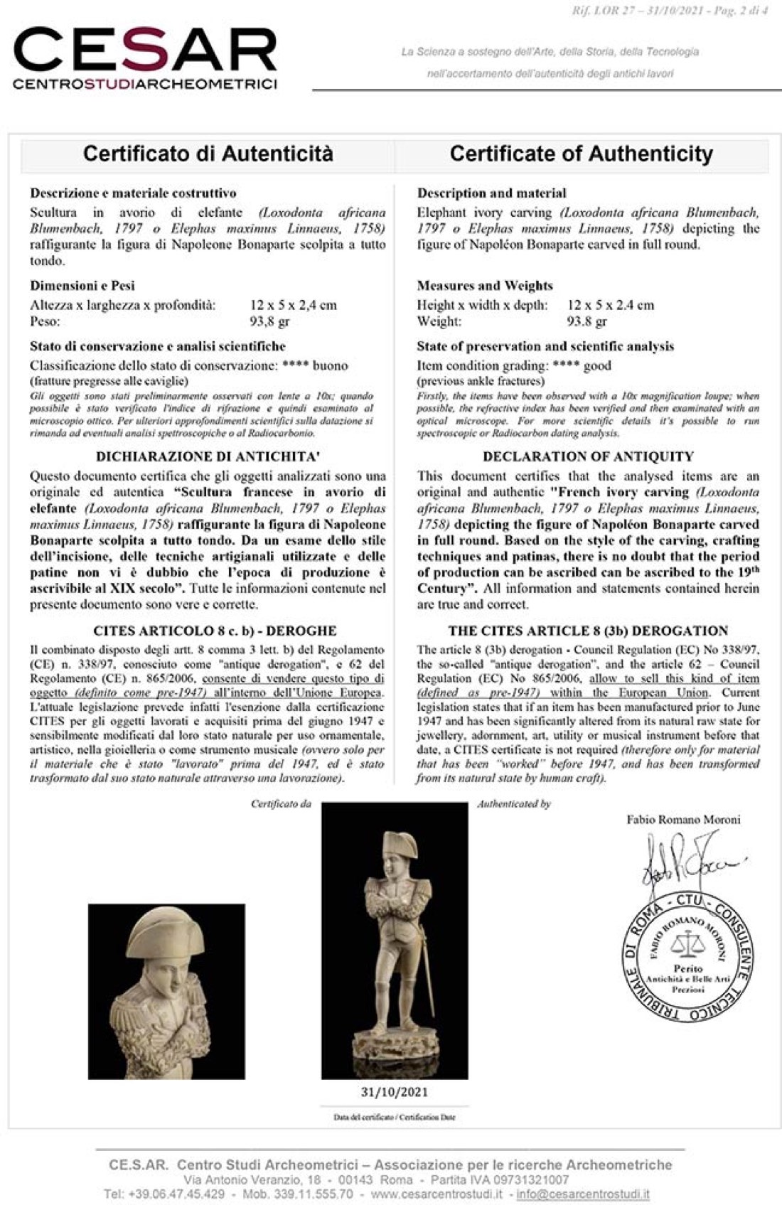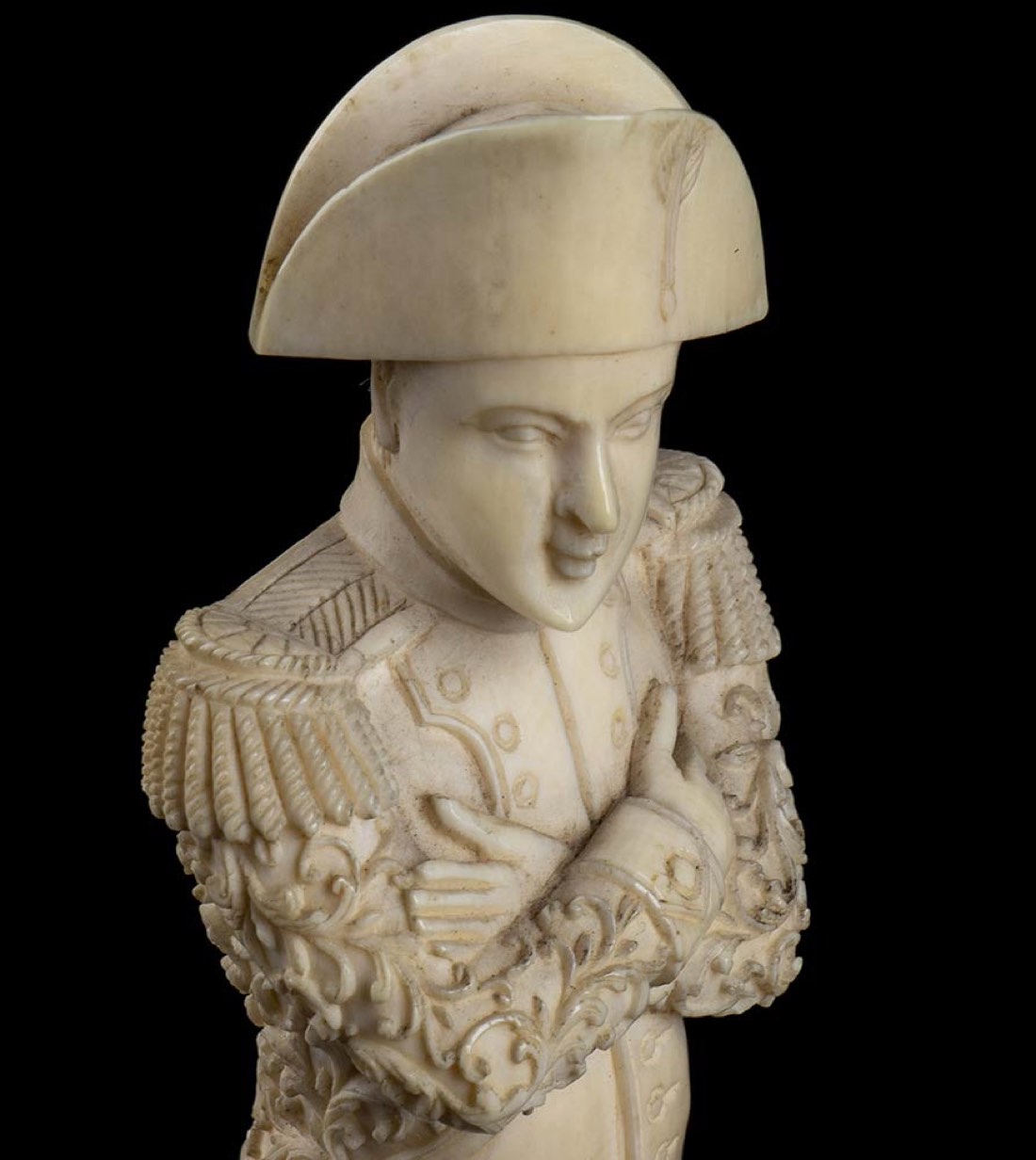 in avorio di elefante (Loxodonta africana Blumenbach, 1797 o Elephas maximus Linnaeus, 1758) raffigurante la figura di Napoleone Bonaparte scolpita a tutto tondo.