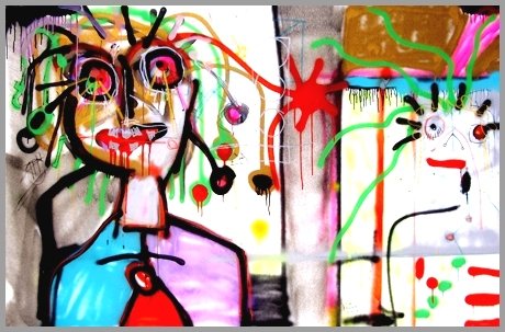 PAUL KOSTABI Whittier (USA) 1962 12345 Take 5 2009 Acrilici e t.m. su tela 100 x 150. Firma e data in b. a d.; sul verso firma e titolo. Autentica dell’autore su foto. Opera realizzata dall’artista durante la performance aperta al pubblico del 24 ottobre 2009 nei locali della Saletta d’Arte Viviani a Pisa. L’opera è corredata da alcune fotografie scattate durante l’esecuzione.