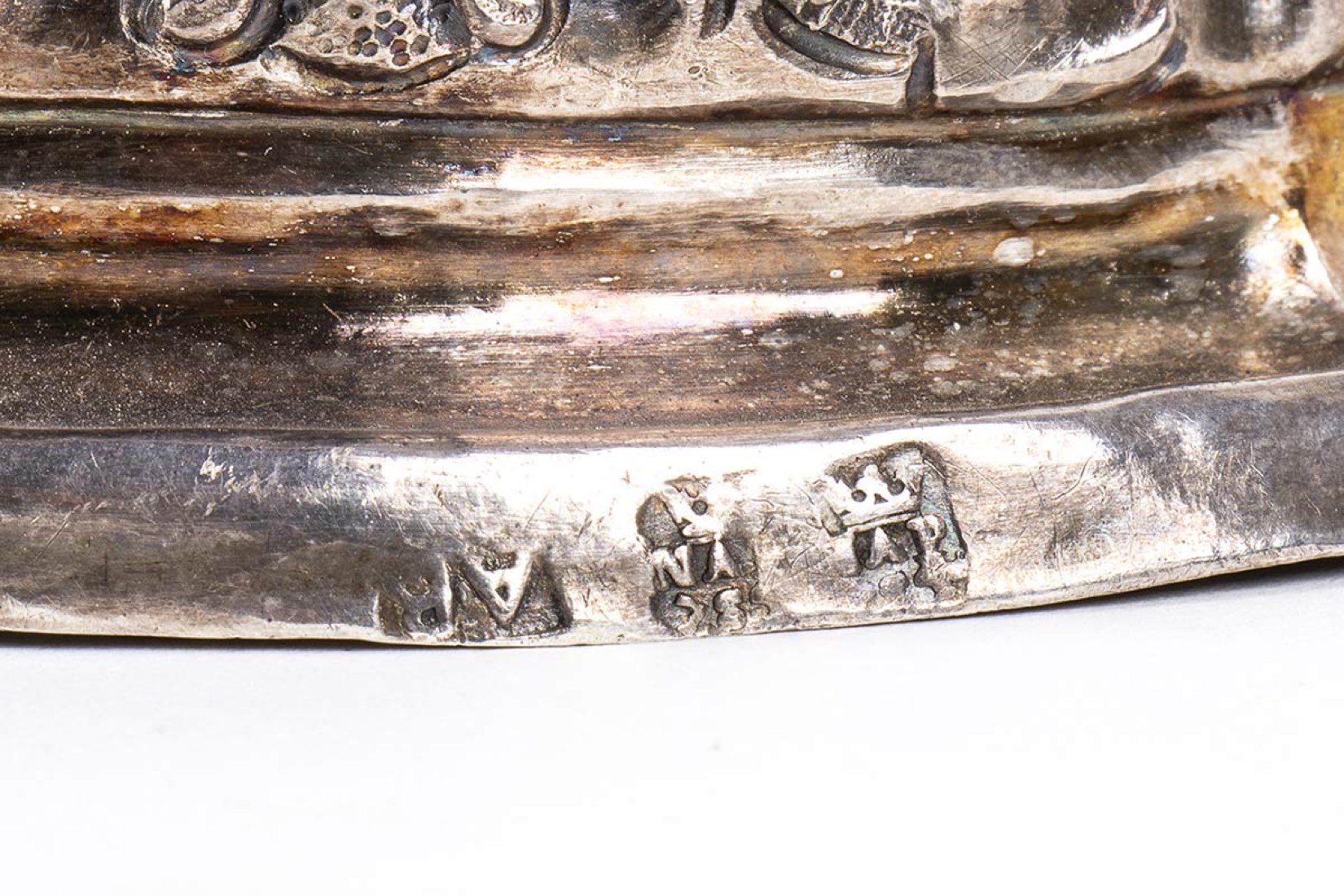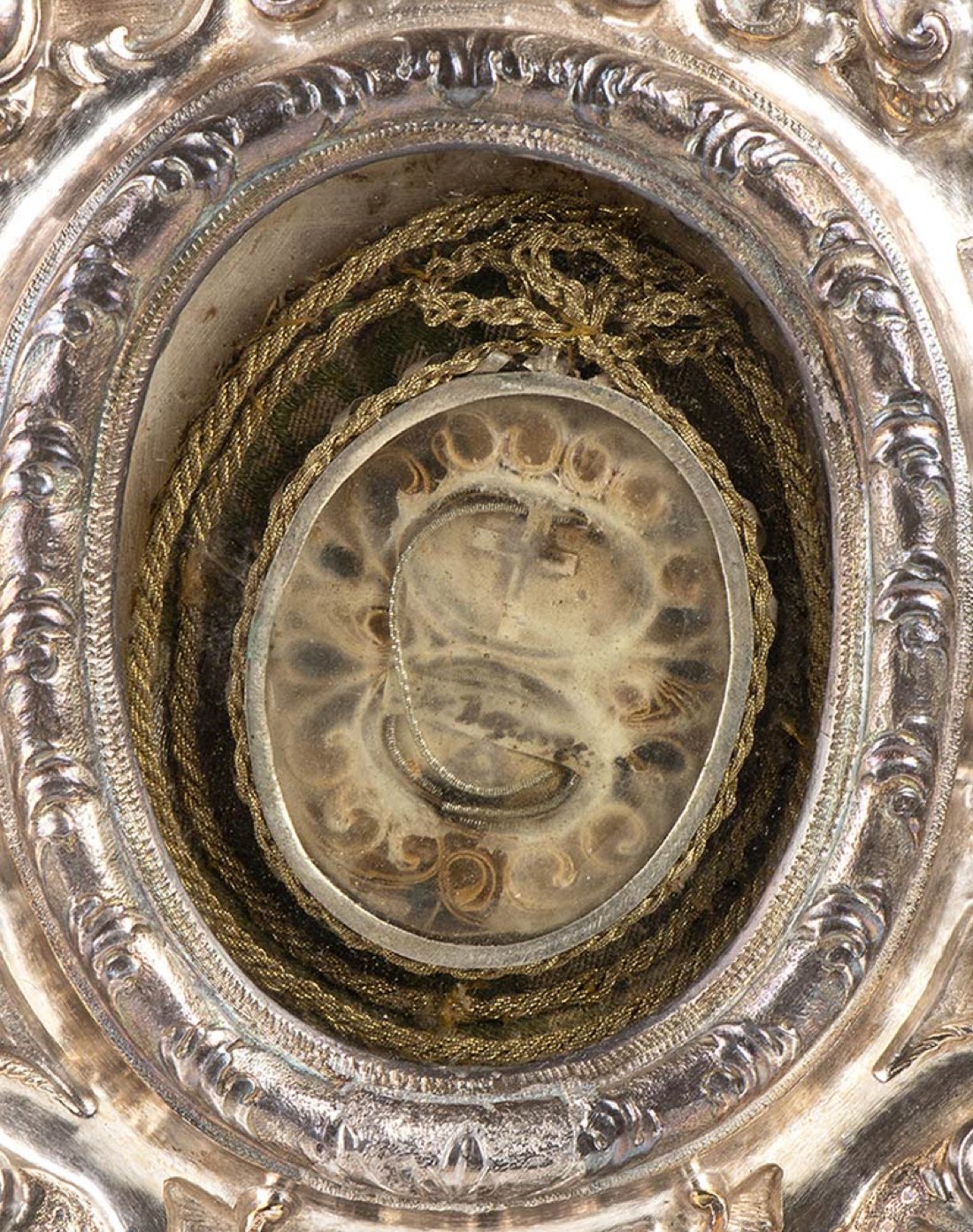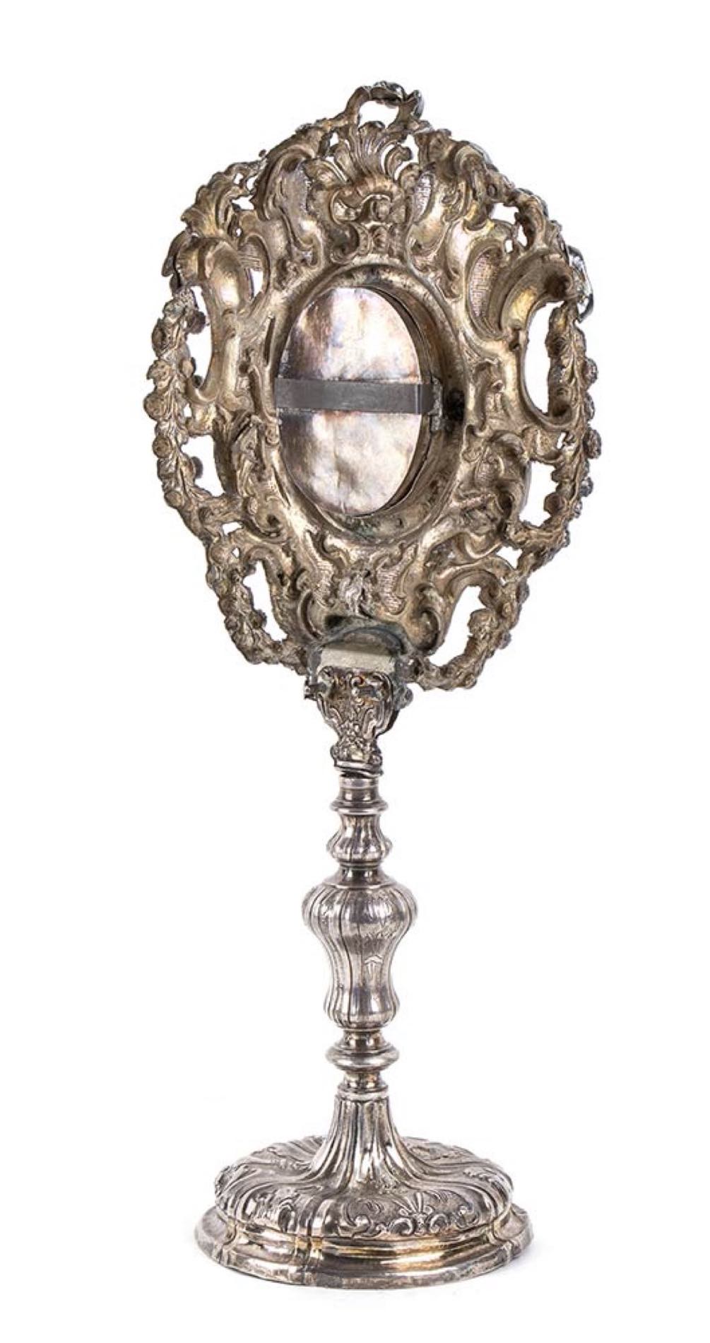base circolare decorata con foglie e croce, parte superiore a volute floreali centrata dal reliquiario. Punzonato due volte con il marchio dell'arte di Napoli per il 1785 e con il marchio di un argentiere o console non identificato.