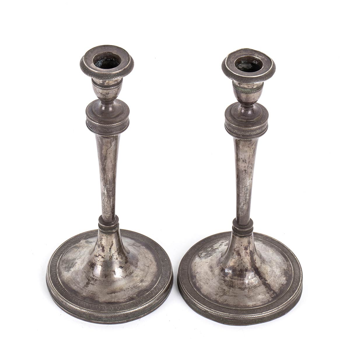 base circolare con decorazione a palmette, fusto con troncoconico e bobéche con decorazioni analoghe alla parte inferiore. Punzonati con il marchio in uso alla corporazione degli orefici di Napoli per l'argento al titolo di 833/1000, 1824-1832.