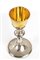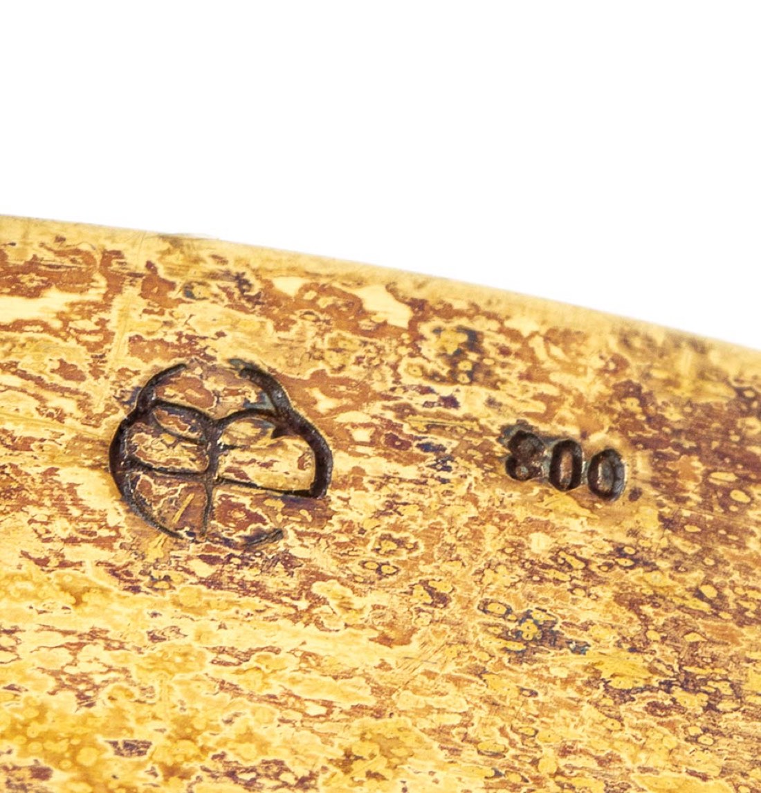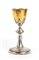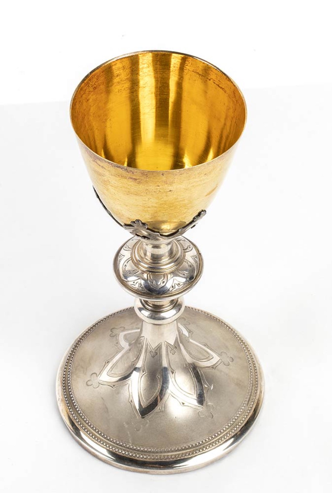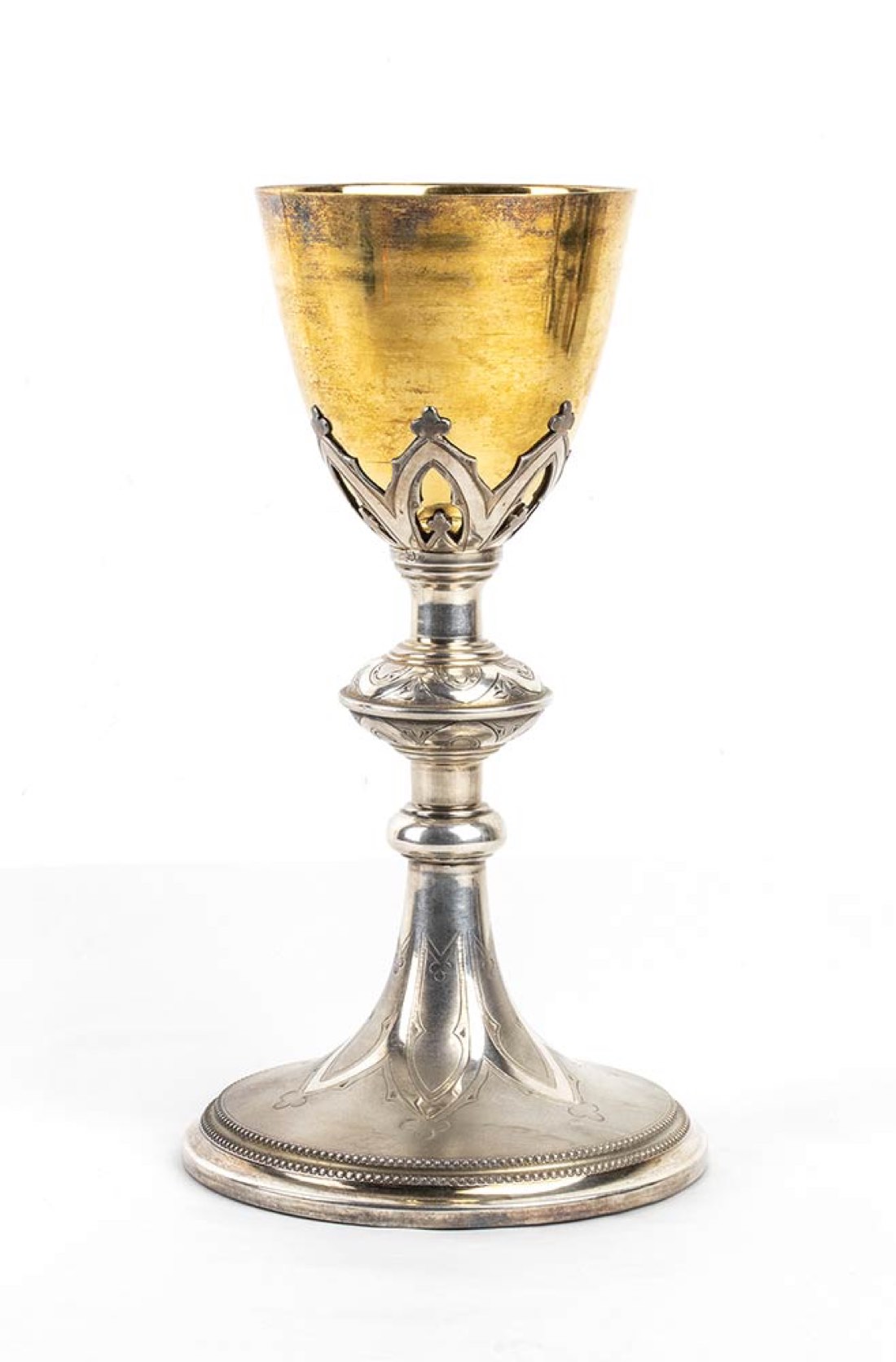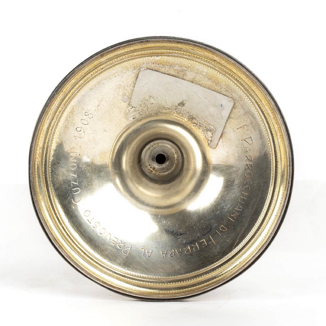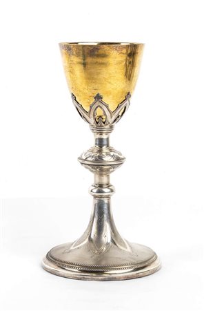 a base circolare perlinata, fusto a balaustro e nodo a decori vegetali, reggicoppa traforato e coppa dorata internamente ed esternamente. Argento 800/1000, punzonato "800". Sotto la base l'iscrizione "I parrocchiani di Ferrara al Prevosto Cuzzoni 1908". Altezza 23,5 cm, diametro base 12,5 cm. Peso 426 gr. Stato di conservazione: **** buono.