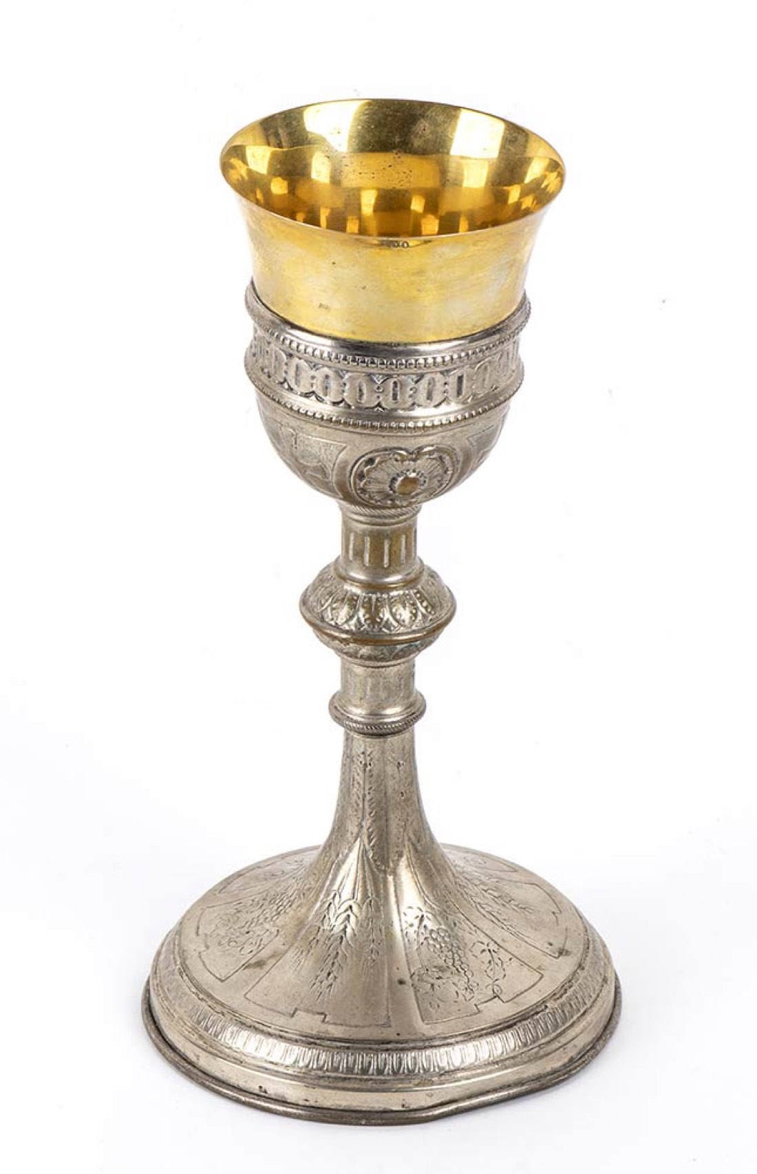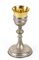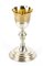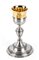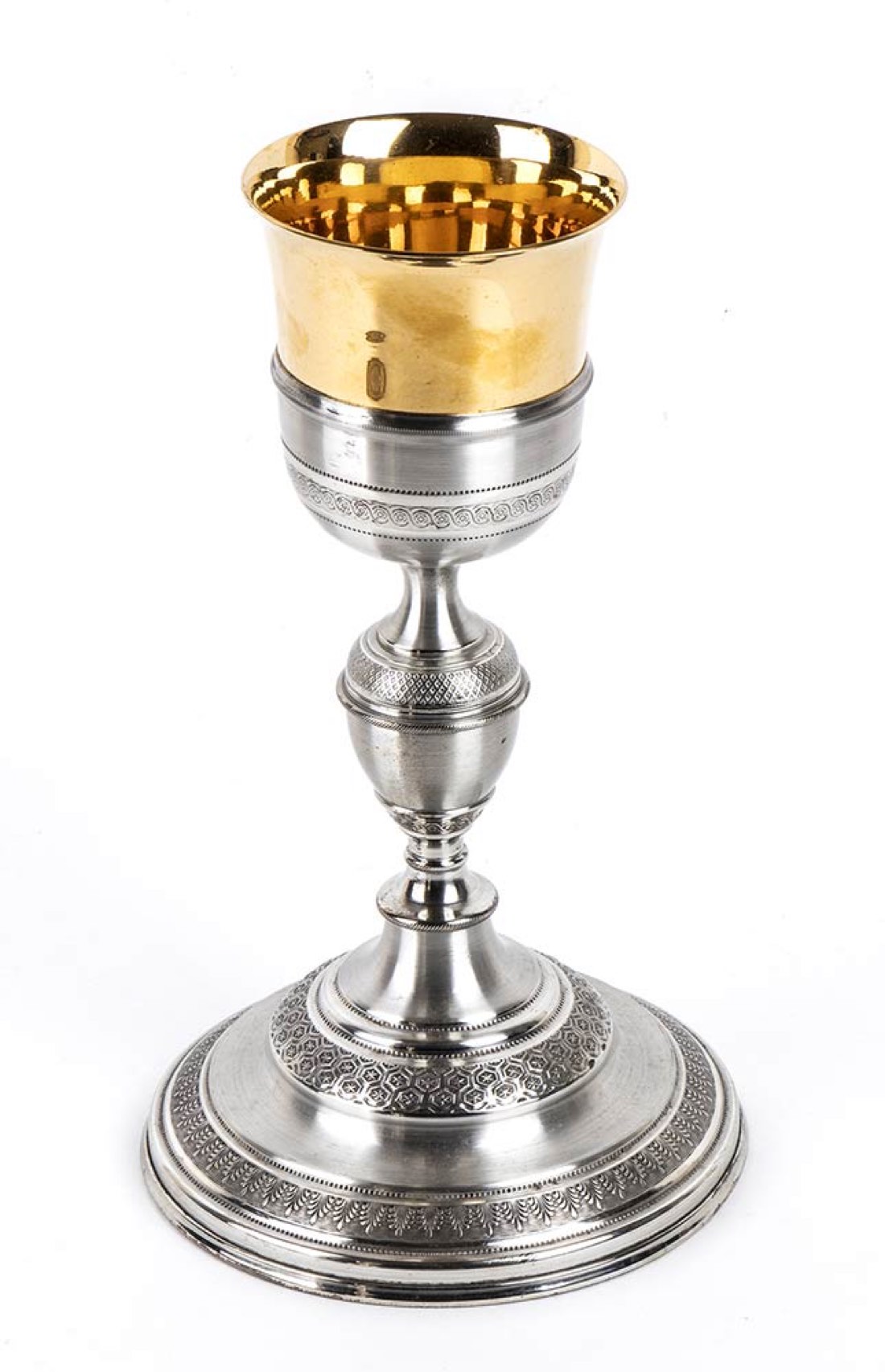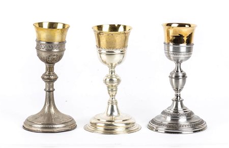 a base circolare gradinata, fusto a balaustro e coppe dorate internamente ed esternamente. Dimensioni: altezza 21,5 cm, diametro base 11,5 cm, peso 275 gr con coppa in argento punzonata "800"; altezza 21 cm, diametro base 12 cm, peso 344 gr; altezza 21,5 cm, diametro base 12,5 cm, peso 445 gr. Stato di conservazione: *** discreto (difetti).