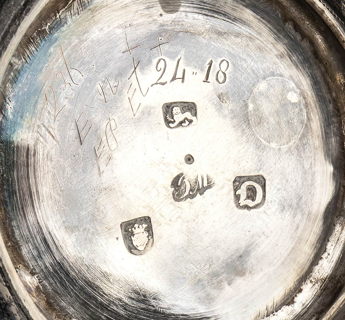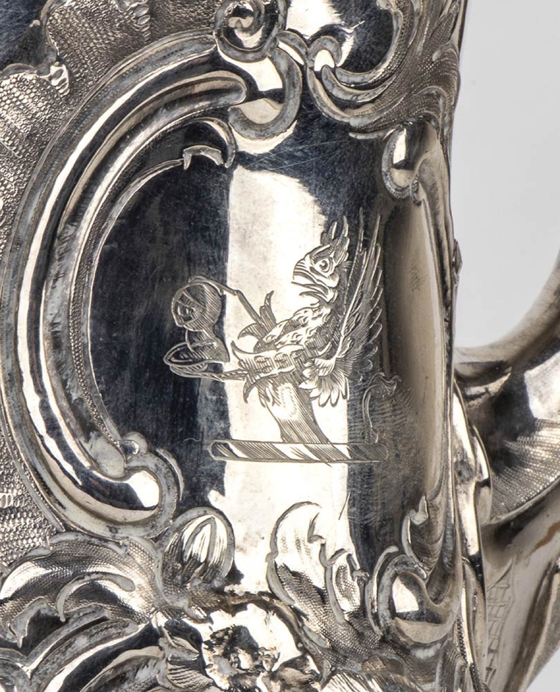 base di forma circulare, corpo piriforme su cui è incisa la crest di famiglia, modanatura godronata intorno al coperchio e al piede, coperchio duomato e manico di legno. Argento 925/1000, serie completa di marchi Londra 1769-70, argentiere William Grundy (Rif. Jackson's pag. 57, Grimwade pag. 222 nr 3147).