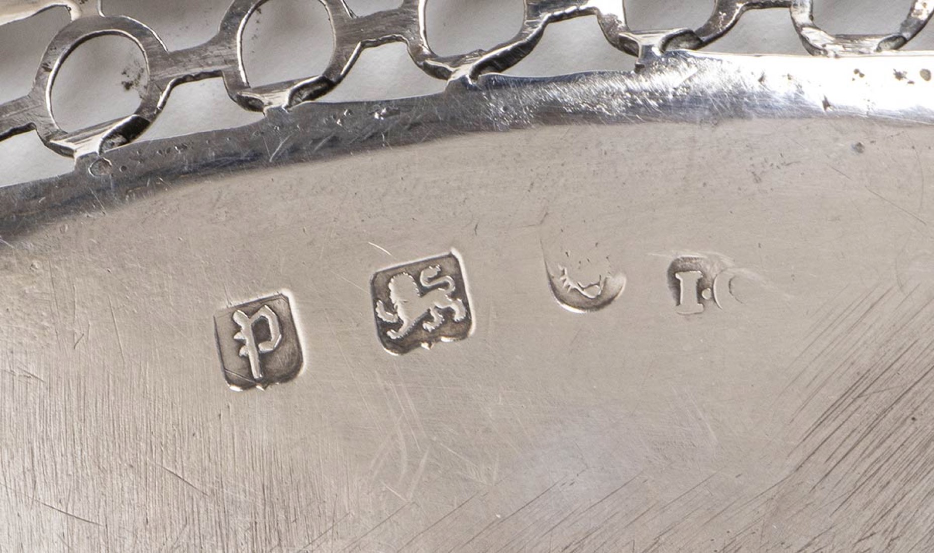 di forma circulare con bordo traforato, poggiante su tre piedini traforati. Argento 925/1000, serie completa di marchi Londra 1770-1771, argentiere John Carter II (Rif. Jackson's pag. 57, Grimwade pag. 94 nr. 1215).