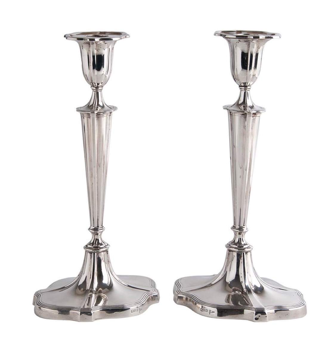 con basamento sagomato e piattini salva cera removibili. Argento 925/1000, serie completa di marchi Chester 1908-1909, argentieri Walker & Hall. (Rif. Jackson's p. 395; Culme vol.1 p. 463; Culme vol.2 p. 322). Base 16 x 12,8 cm, altezza 29 cm. Peso complessivo 2043 gr. Stato di conservazione: **** buono.