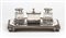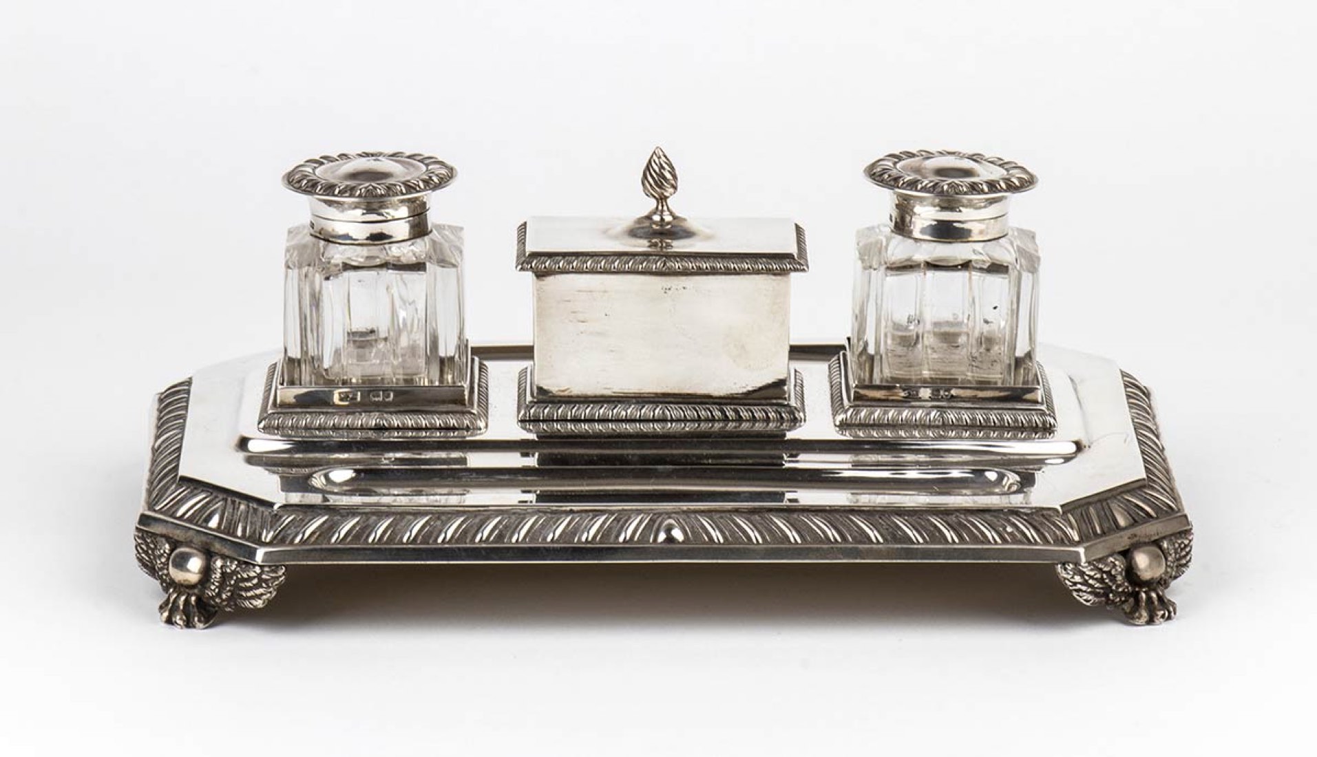 di forma rettangolare sagomata, poggiante su quattro piedini ferinii; contenitore centrale affiancato da due porta inchiostro. Argento 925/1000, serie completa di marchi Londra 1900-1901, maestro argentiere Mappin & Webb.