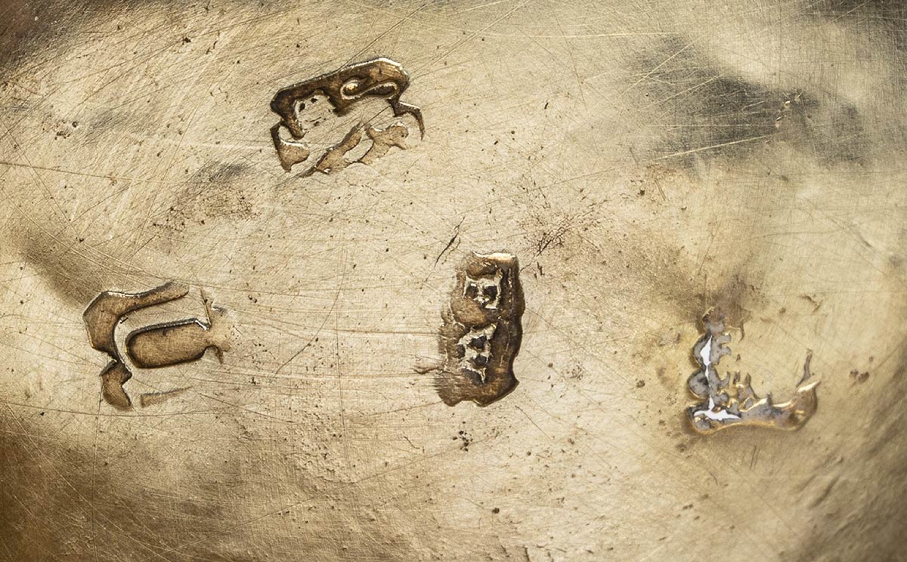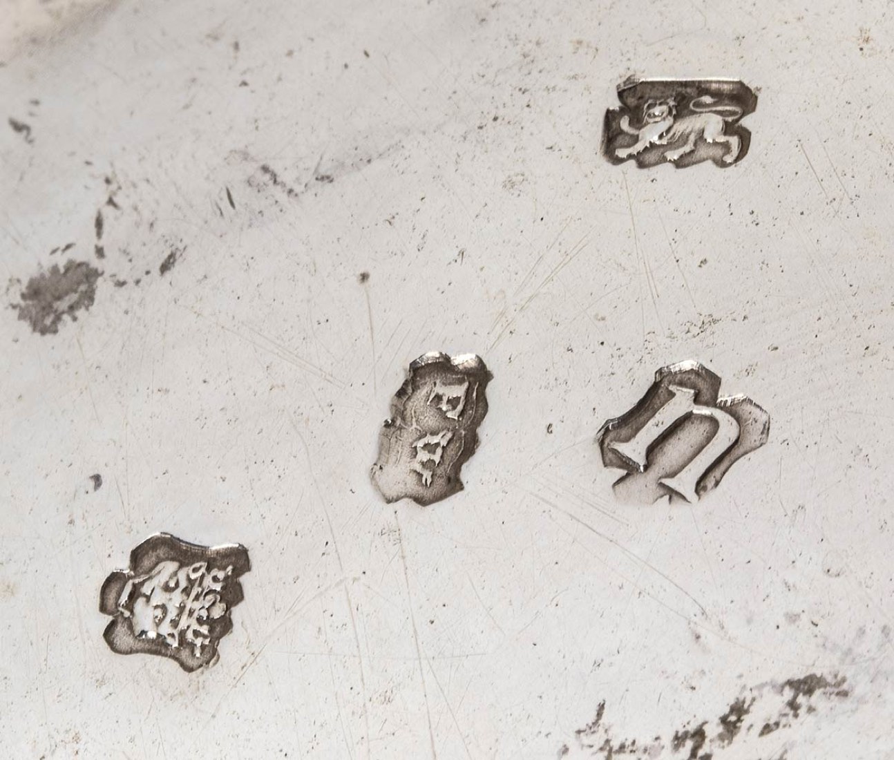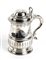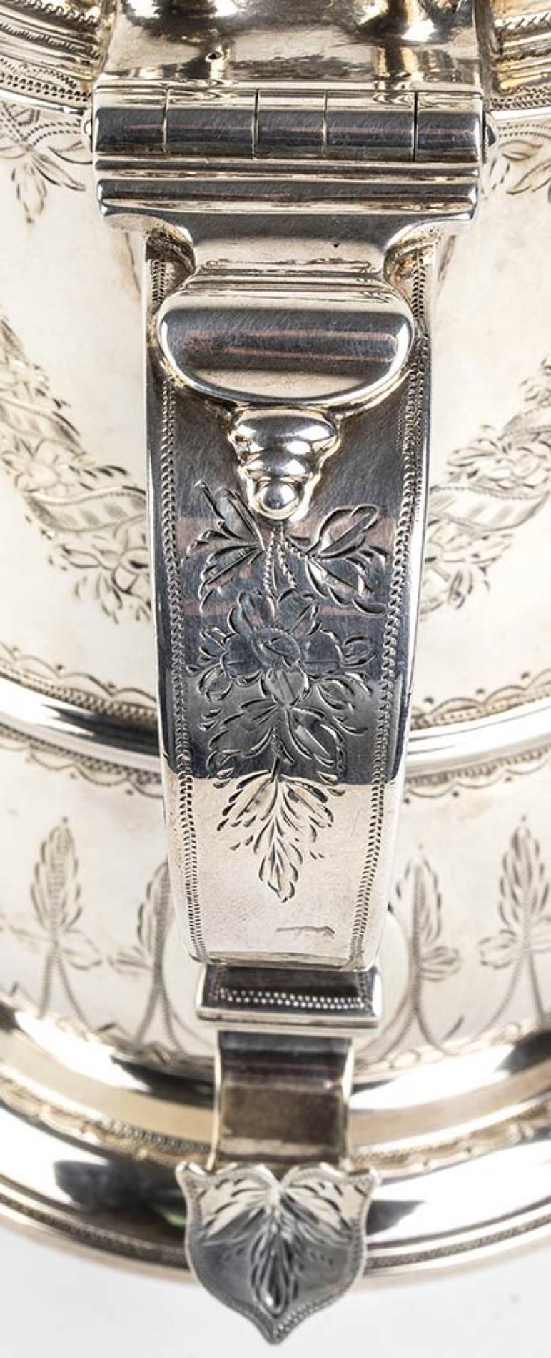 corpo a balaustro inciso con decori floreali, coperchio duomato, poggiadito traforato, manico a voluta con terminale a cuore. Argento 925/1000, serie completa di marchi Londra 1748-49, argentiere Fuller White (Rif. Jackson's pag. 56, Grimwade pag. 62 nr 732). Diametro piede 12 cm, altezza 20 cm, larghezza con manico 17,5 cm Peso 810 gr. Stato di conservazione: **** buono.