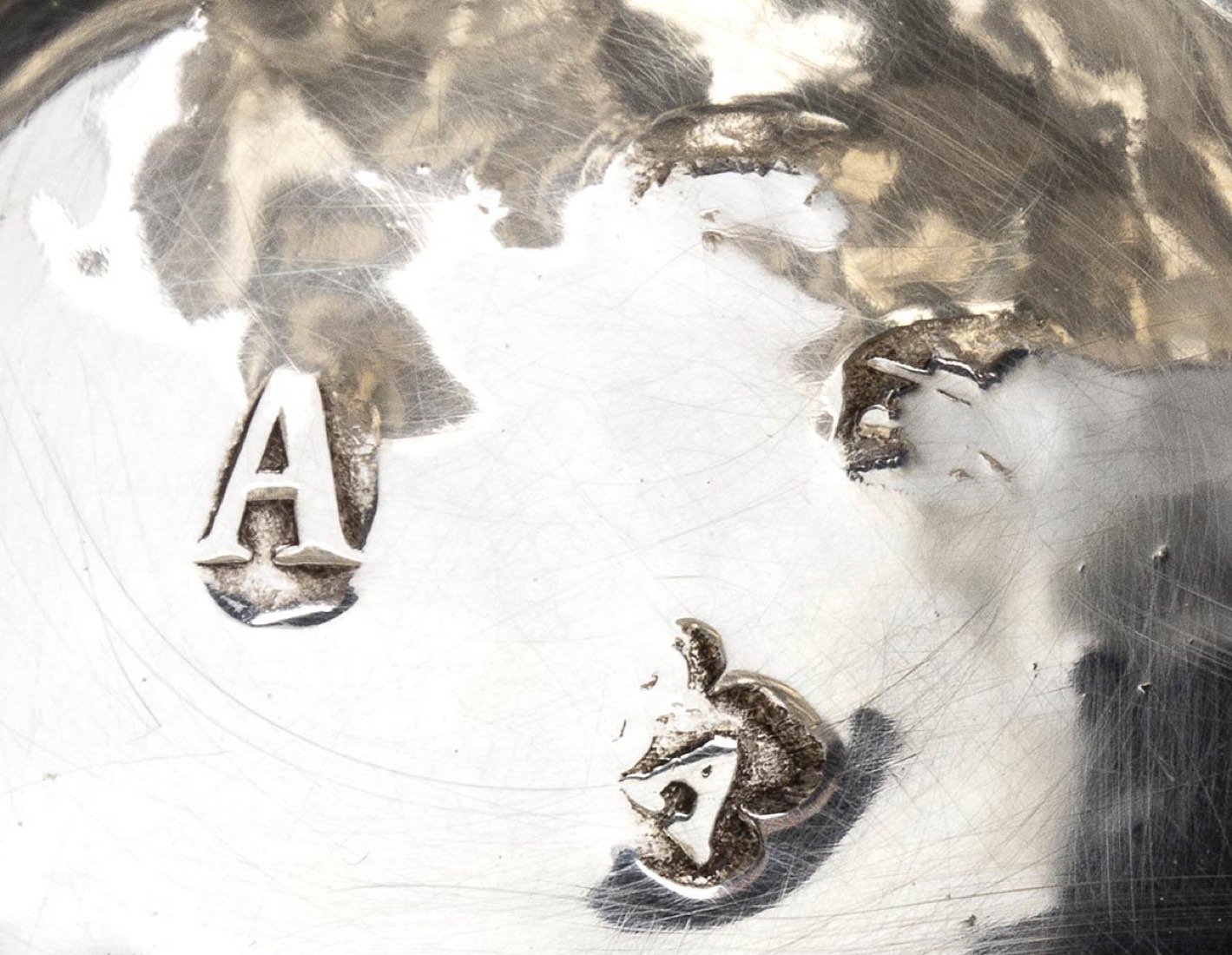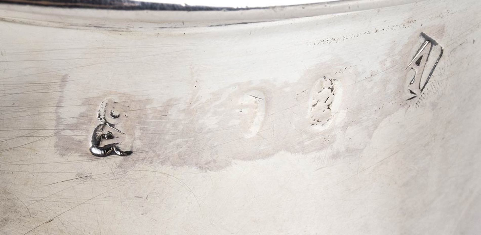 corpo a balaustro liscio con coperchio duomato, poggiadito a voluta fogliata, manico a voluta con terminale a cuore. Serie completa di marchi in uso per l'argento Britannia 958/1000 Londra 1716-17, argentiere Richard Bayley (Rif. Jackson's pag. 56, Grimwade pag. 21 nr 116). Diametro piede 12,4 cm, altezza 18,5 cm, larghezza con manico 17,5 cm. Peso 1000 gr. Stato di conservazione: **** buono.