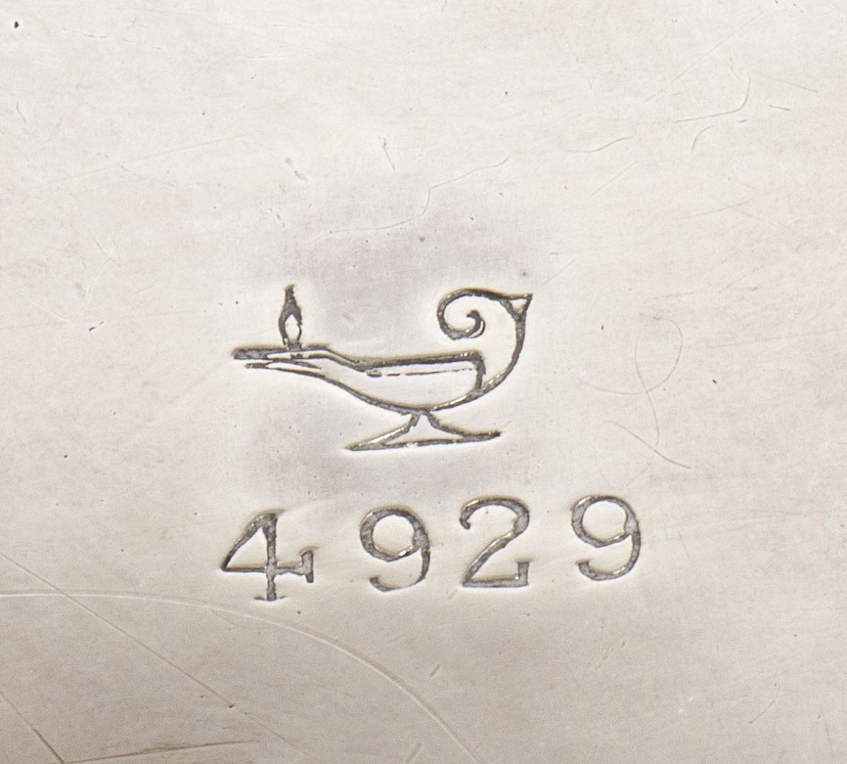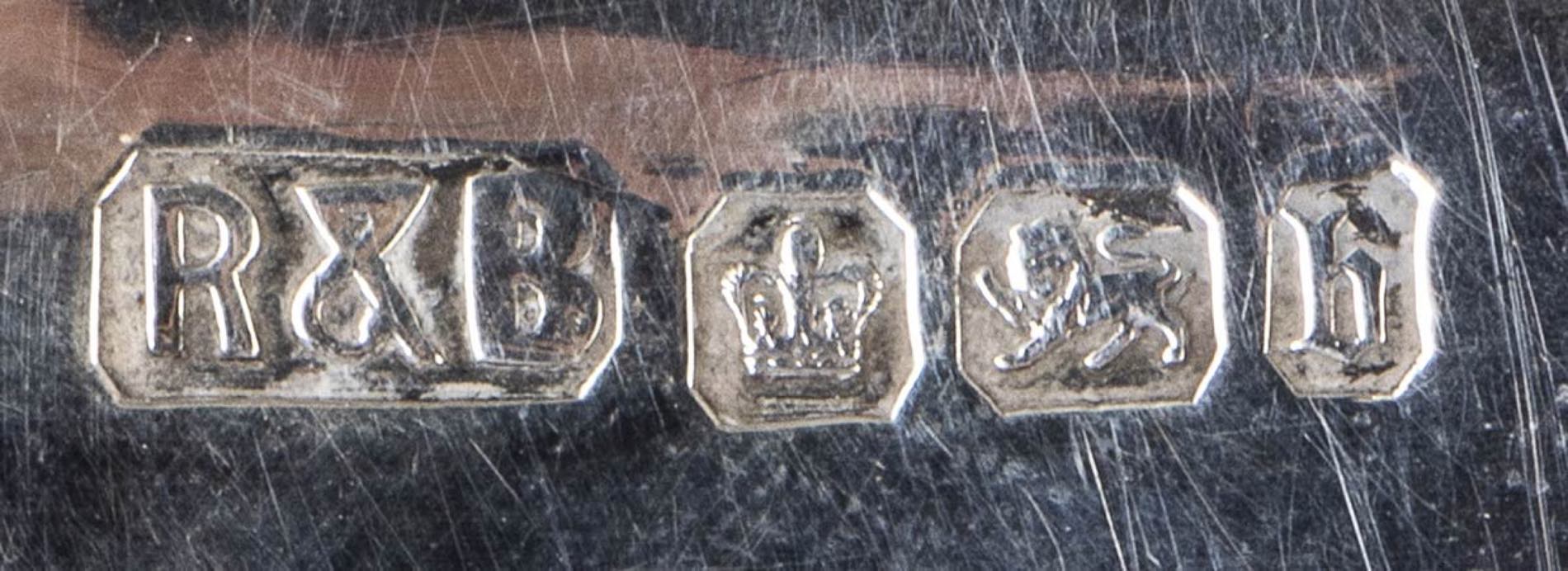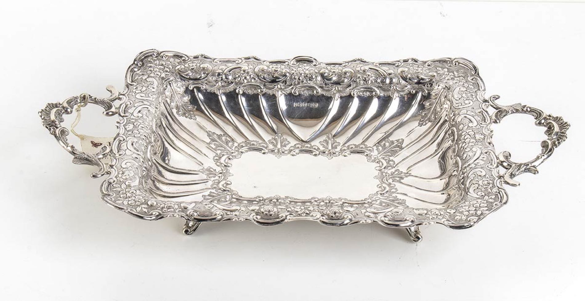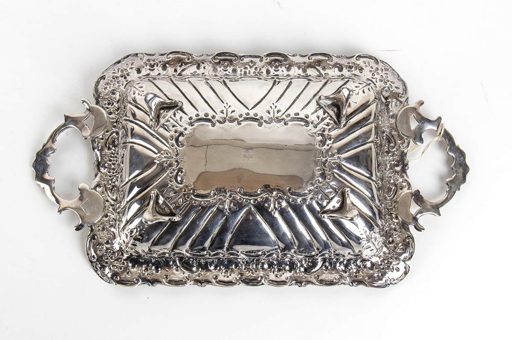 di forma rettangolare con manici laterial, decorato con fiori e volute. Argento 925/1000, serie completa di marchi Sheffield 1894-1895, argentieri Roberts & Belk (Rif. Jackson's p. 432; Culme vol.1 p.289; Culme vol.2 p.247).