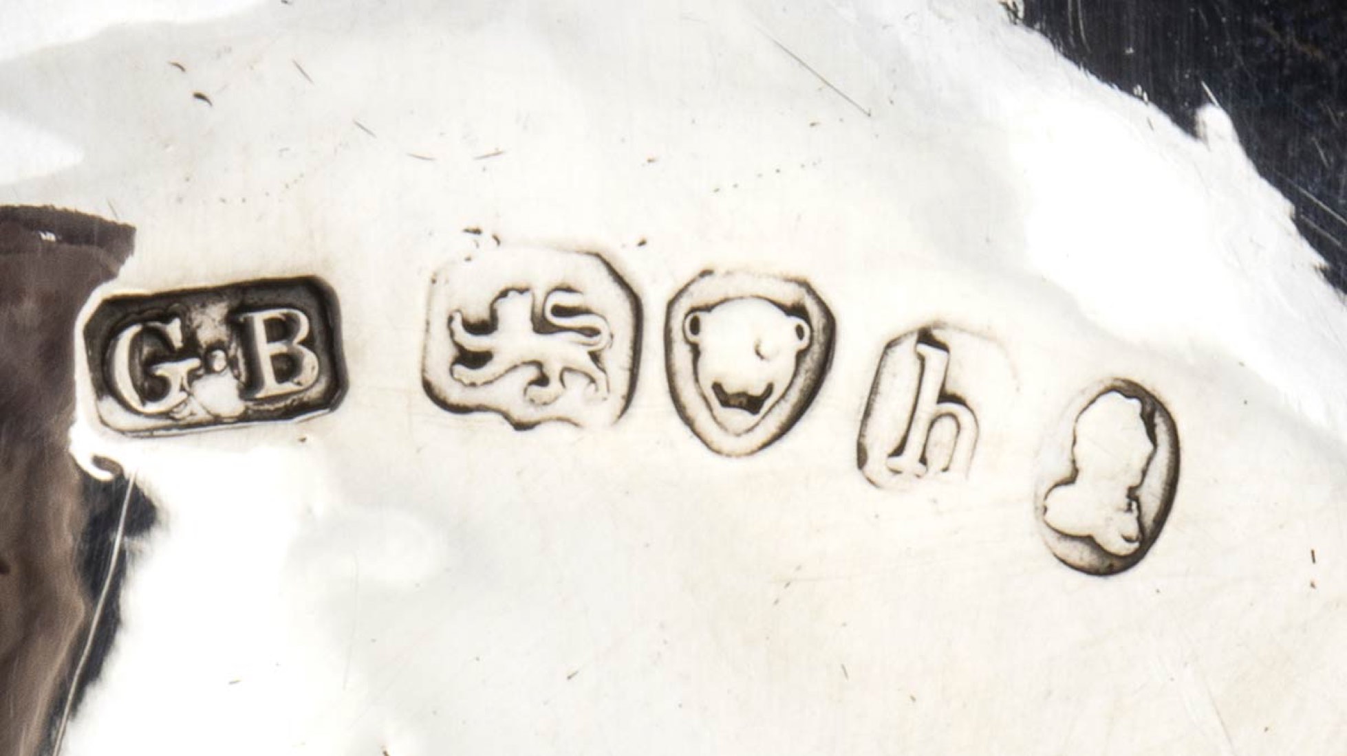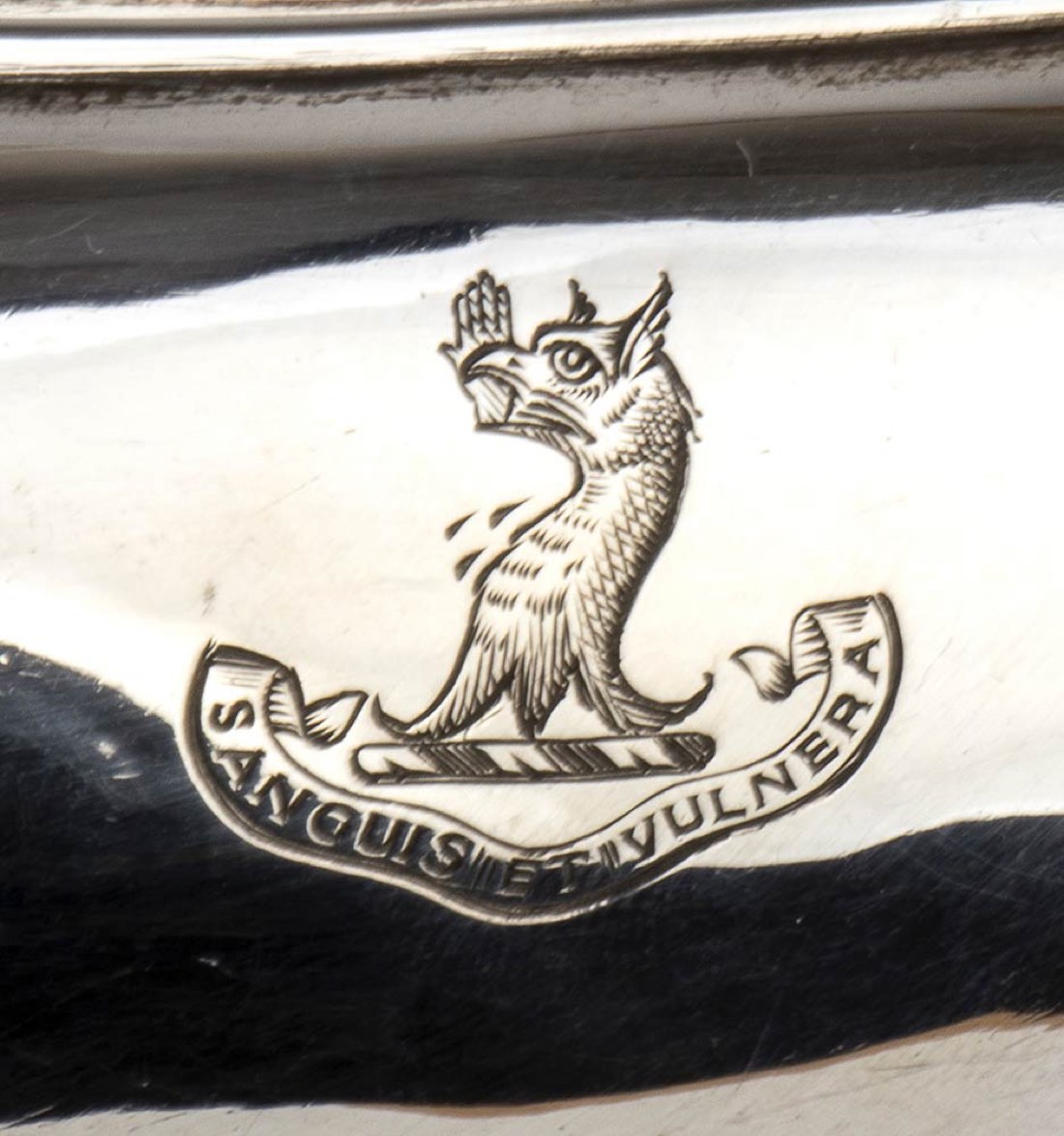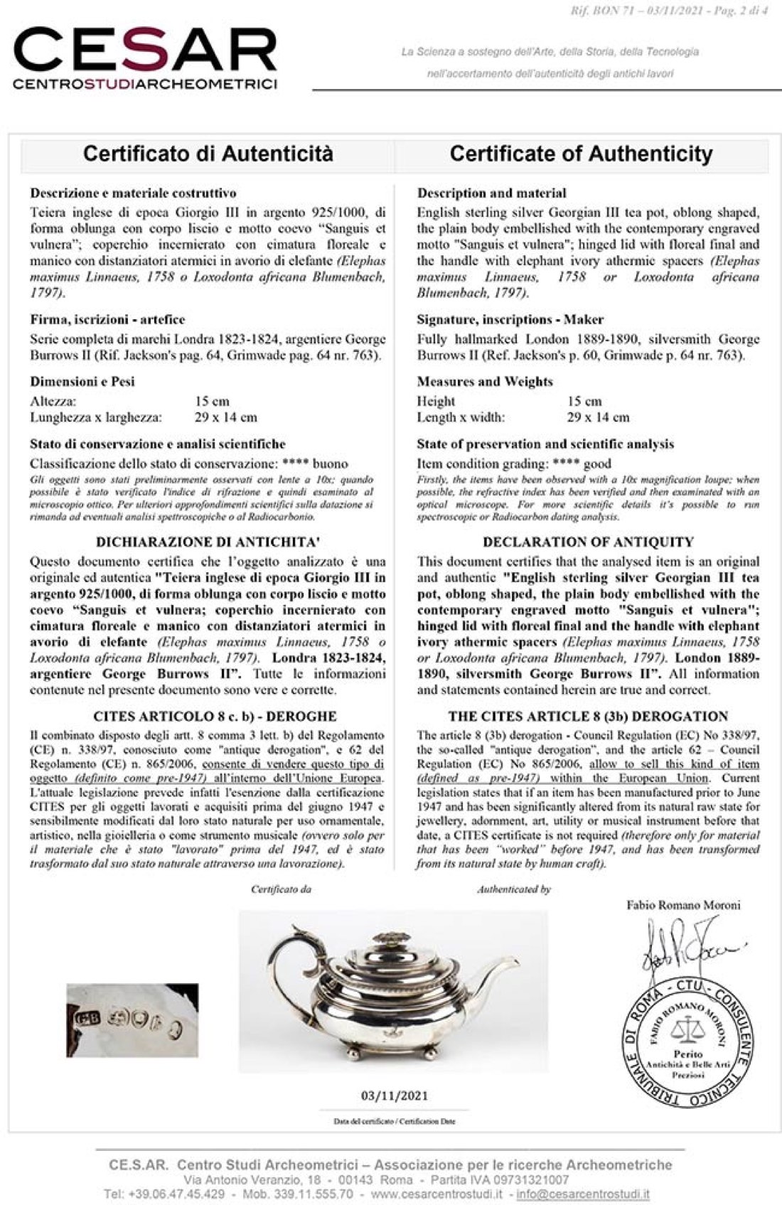 di forma oblunga, corpo liscio con il motto coevo "Sanguis et vulnera"; coperchio incernierato con cimatura floreale e manico con distanziatori atermici in avorio di elefante (Elephas maximus Linnaeus, 1758 o Loxodonta africana Blumenbach, 1797).Argento 925/1000, serie completa di marchi Londra 1823-1824, argentiere George Burrows II (Rif. Jackson's pag. 64, Grimwade pag. 64 nr. 763).