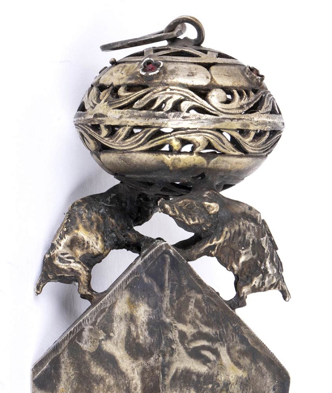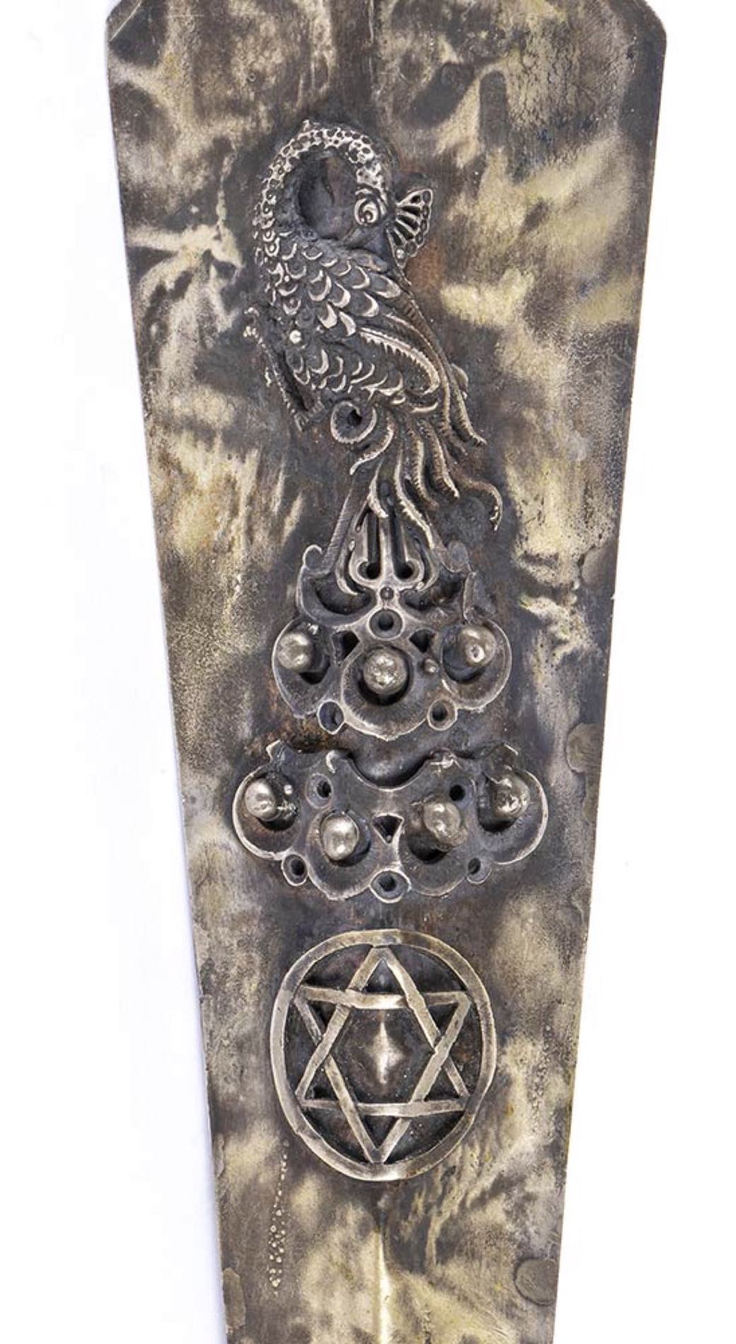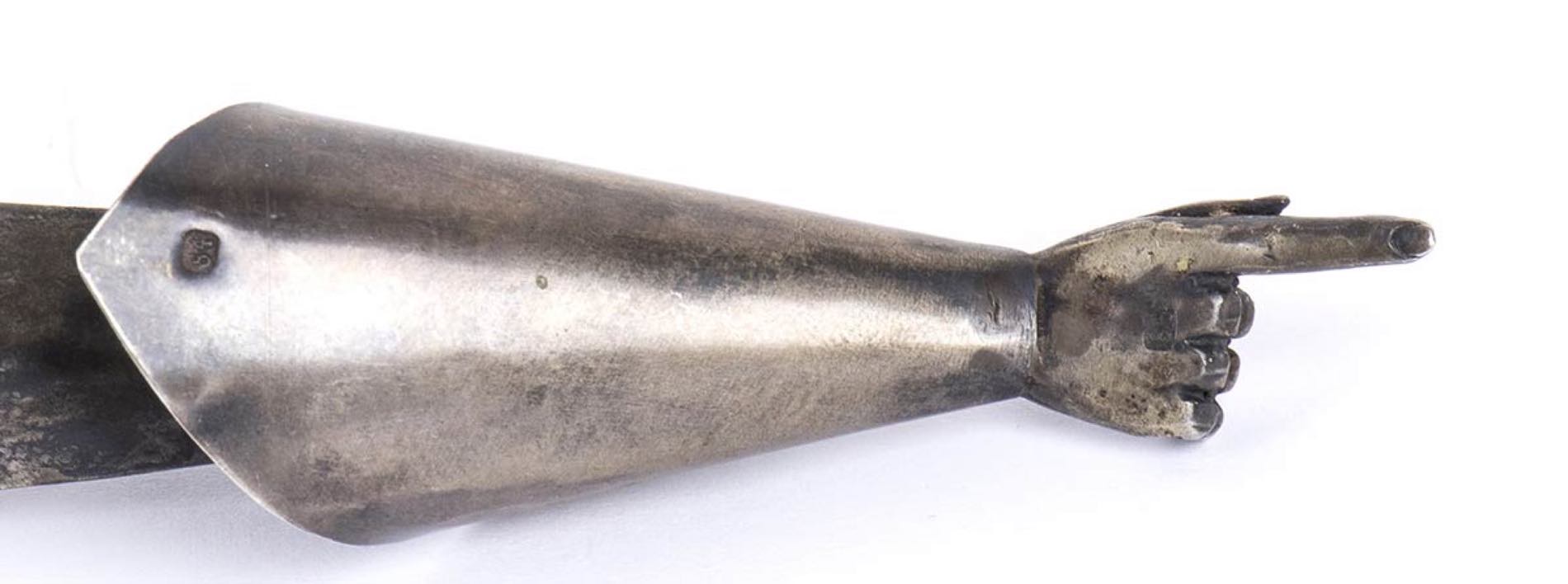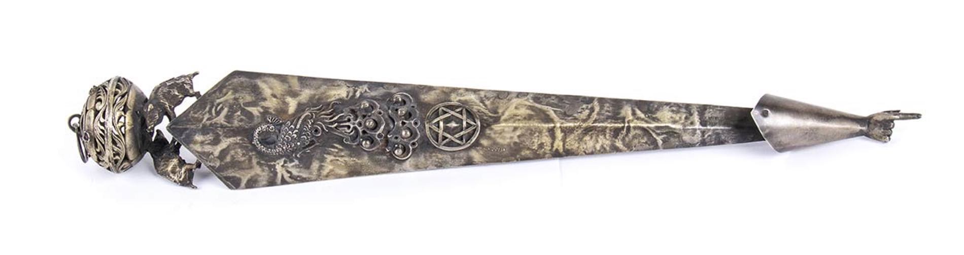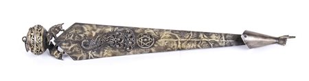 puntatore usato per guidare le letture pubbliche del testo dei rotoli della Torah. Punzonato con marchi Russi apocrifi per l'argento al titolo di 84 zolotniks. Lunghezza 34 cm, larghezza 4,5 cm. Peso 135 gr. Stato di conservazione: **** buono.