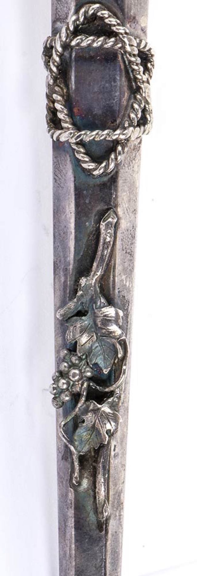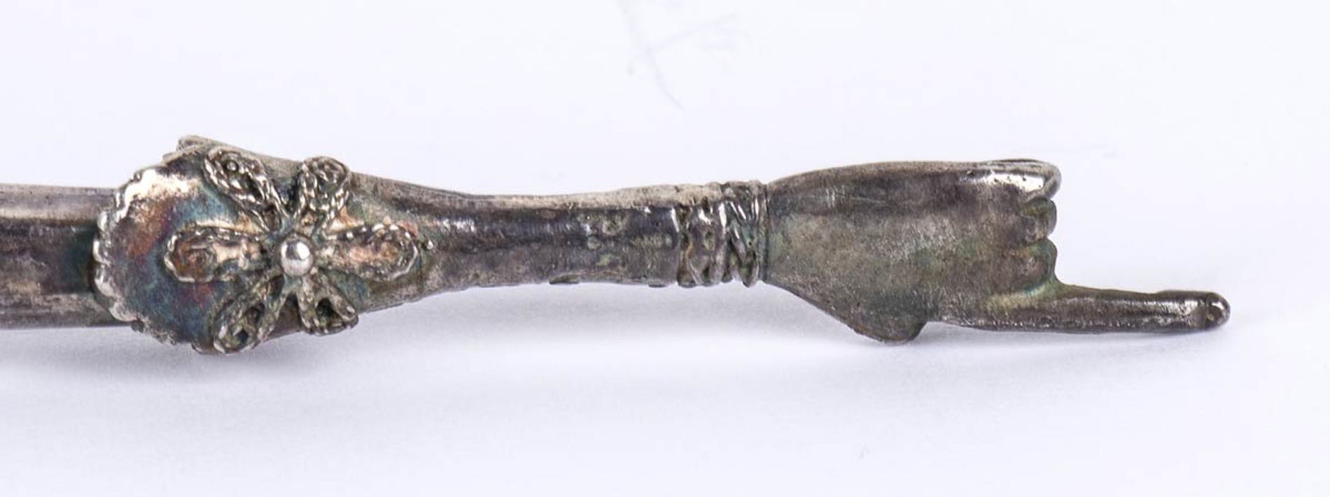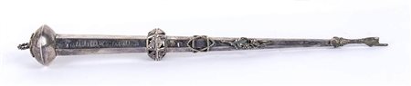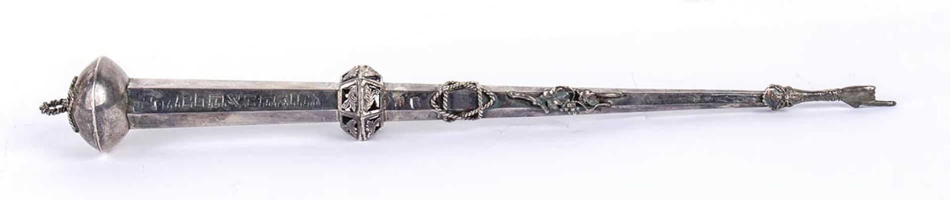 puntatore usato per guidare le letture pubbliche del testo dei rotoli della Torah. Punzonato con marchi Russi apocrifi del 1867 per l'argento al titolo di 84 zolotniks. Lunghezza 32,5 cm, larghezza 3,5 cm. Peso 75 gr. Stato di conservazione: **** buono.