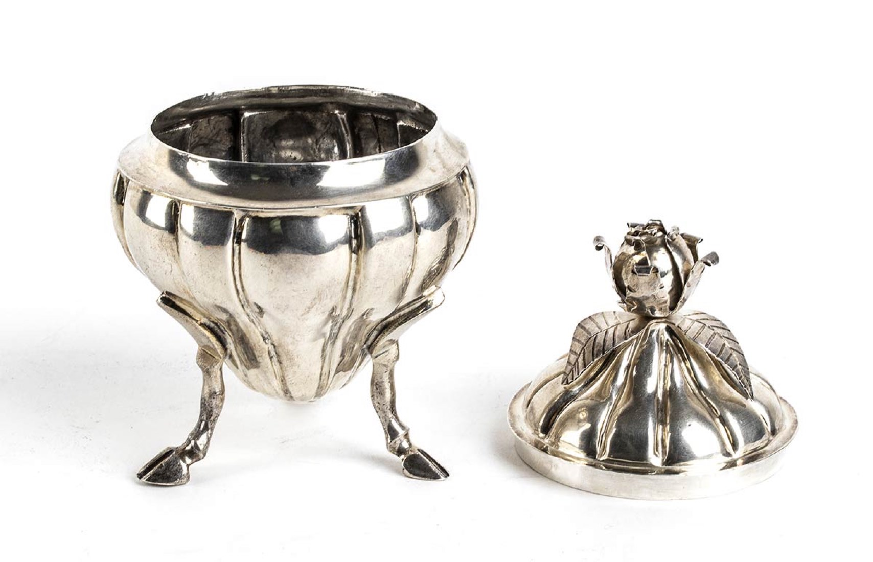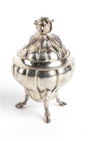 di forma piriforme scanalata, poggiante su tre piedini a zoccolo equini, il coperchio con fastigio a rosa. Punzonata con un marchio dell'argento in uso probabilmente a Malta prima del 1798. Altezza 13 cm, diametro 9 cm. Peso 205 gr. Stato di conservazione: **** buono.